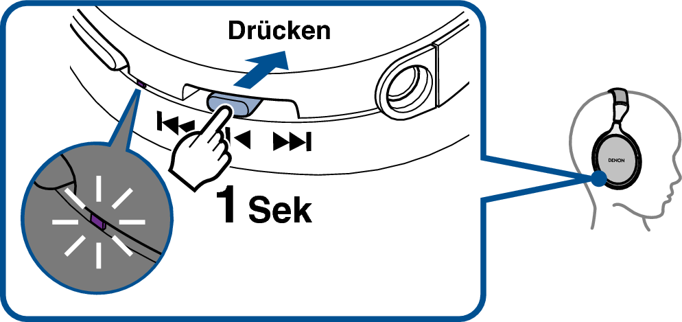 Die Bluetooth-Anzeige am Kopfhörer leuchtet ca. 5 Sekunden lang blau, sobald die Bluetooth-Verbindung hergestellt ist.