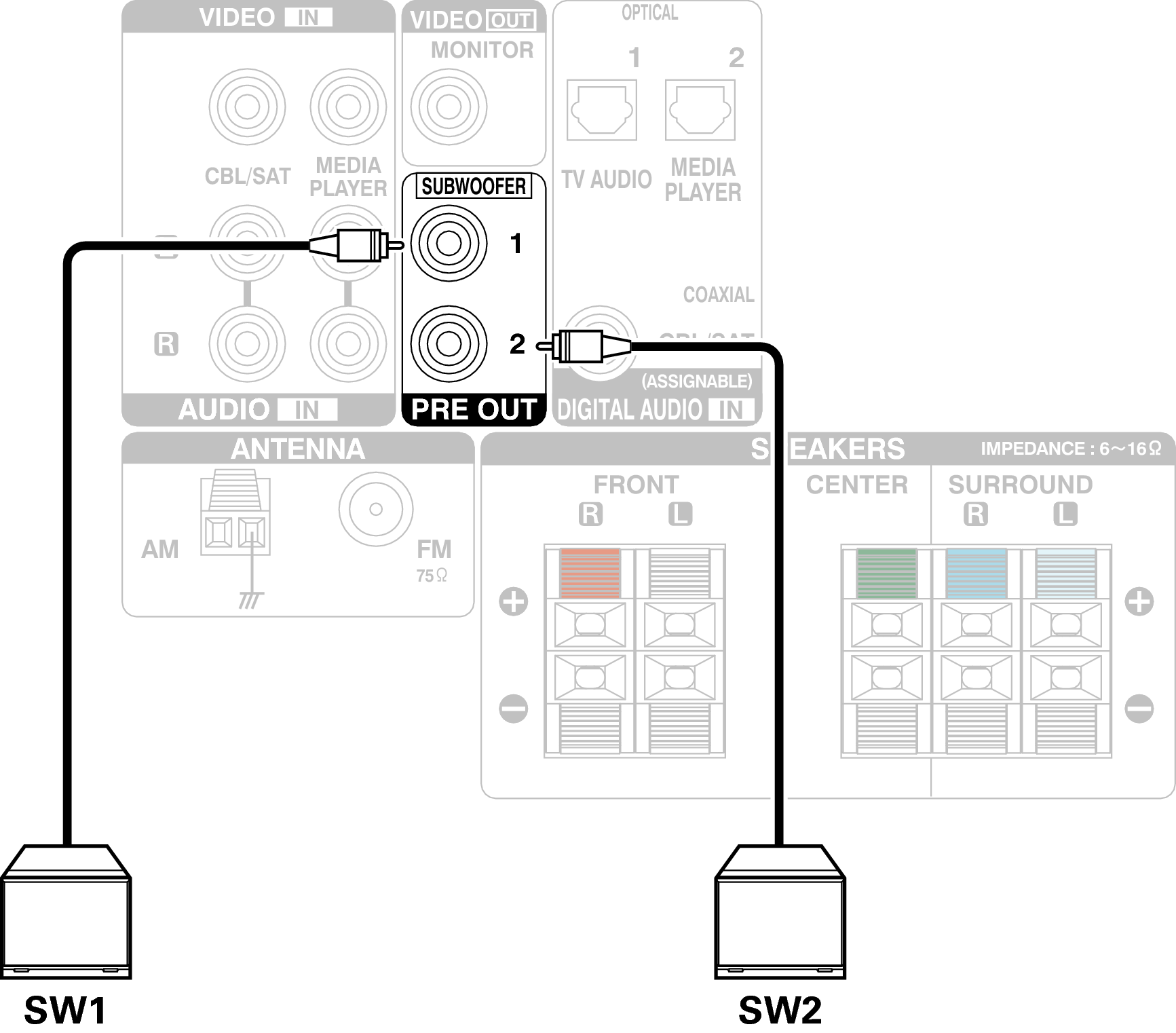 Utilice un cable para subwoofer para conectarlo. Esta unidad admite la conexión de dos subwoofers.