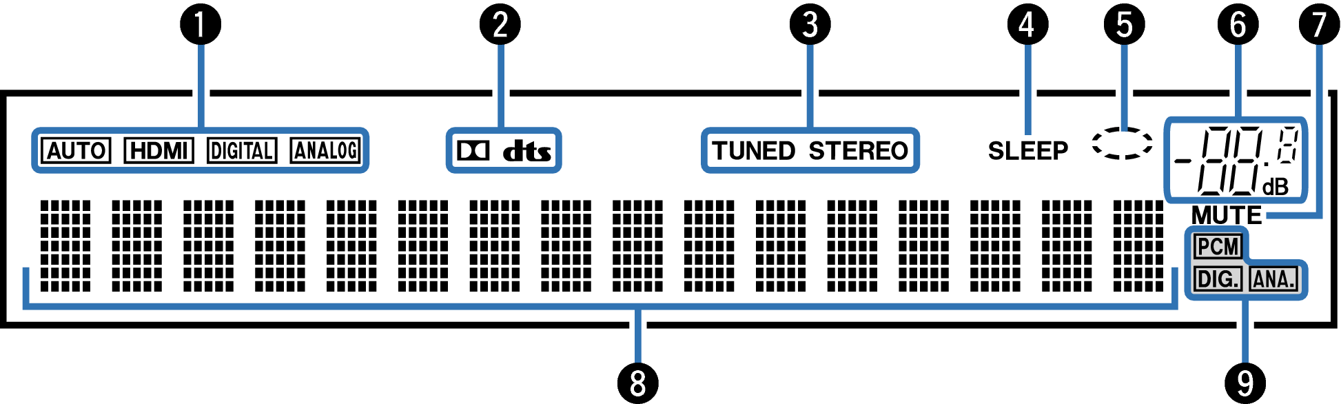 Estes acendem quando são detectados sinais Dolby ou DTS nas entradas ou quando o descodificador Dolby ou DTS está a funcionar.
