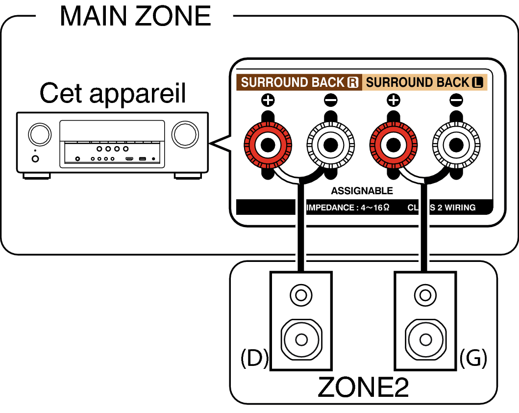 Réglez “Mode affectation”lien sur “ZONE2” et les sorties audio ZONE2 des bornes d’enceintes SURROUND BACK.
