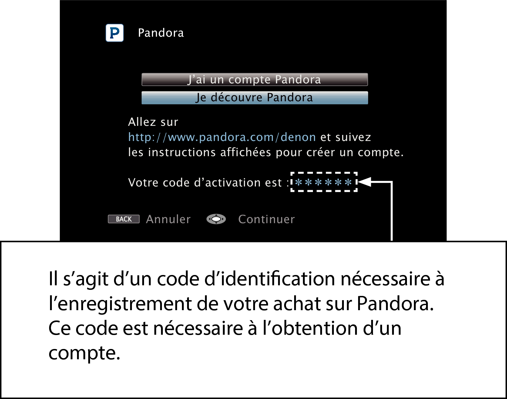 pour sélectionner “J’ai un compte Pandora”, puis appuyez sur ENTER.Si vous ne disposez pas de compte Pandora, appuyez sur ENTER pour sélectionner “I am to new to Pandora”. L’URL de Pandora et le code d’activation s’affichent. Accédez à la page Web de Pandora à partir de votre ordinateur et enregistrez le code d’activation affiché et les informations du compte. Ensuite, appuyez sur ENTER.