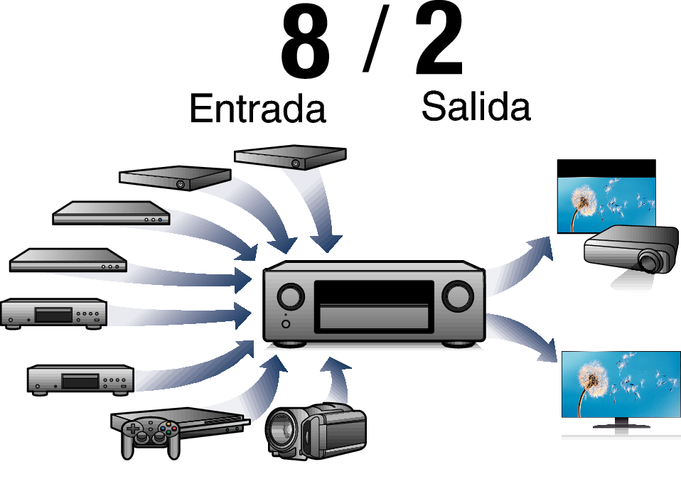 Esta unidad está equipada con 8 entradas HDMI y 2 salidas HDMI que permiten la conexión a varios dispositivos compatibles HDMI, como por ejemplo reproductores Blu-ray Disc, consolas de videojuegos y videocámaras de HD. Esta unidad está equipada con 2 salidas para monitor, permitiéndole proyectar la misma imagen al mismo tiempo utilizando esta unidad.