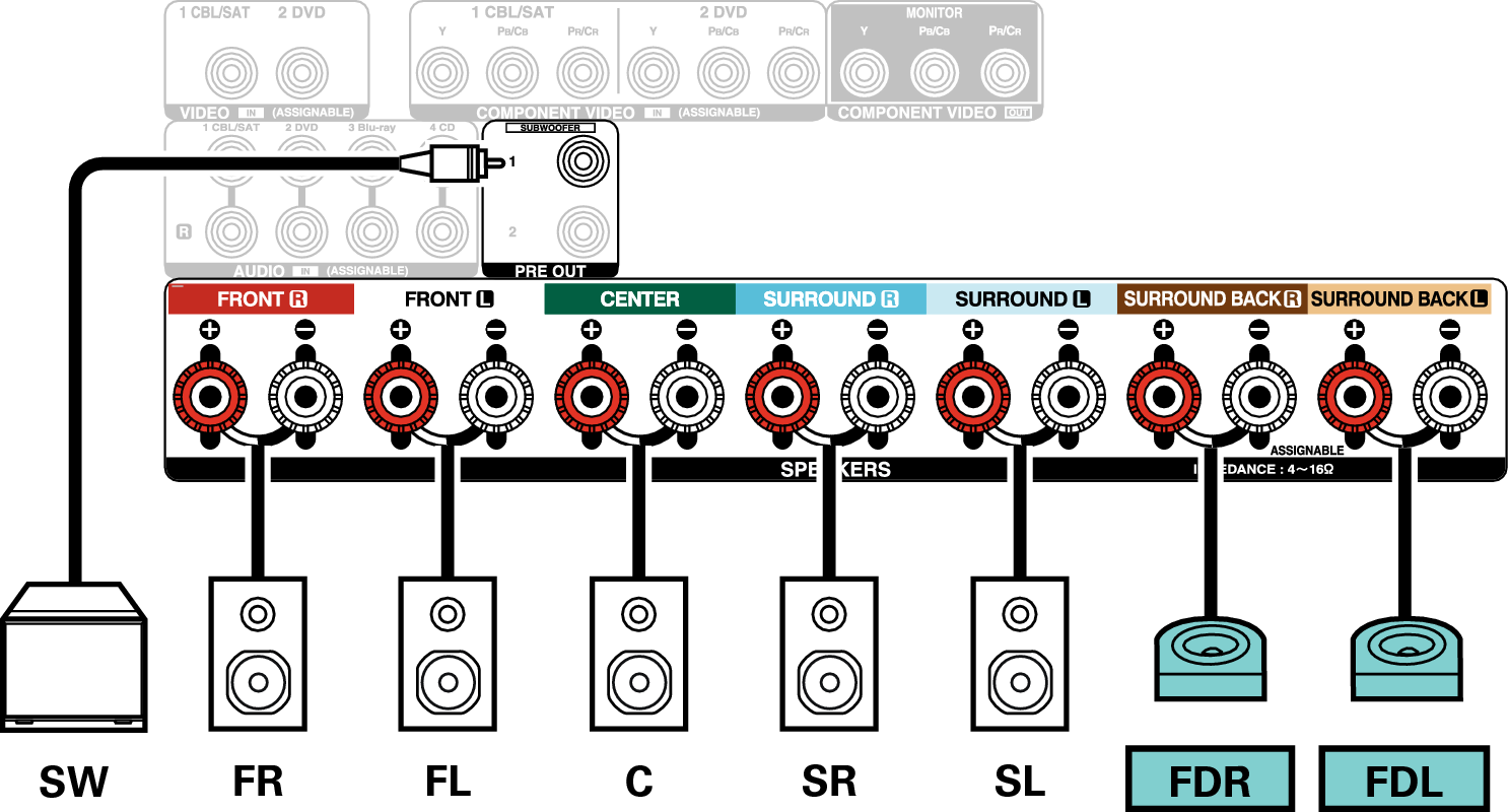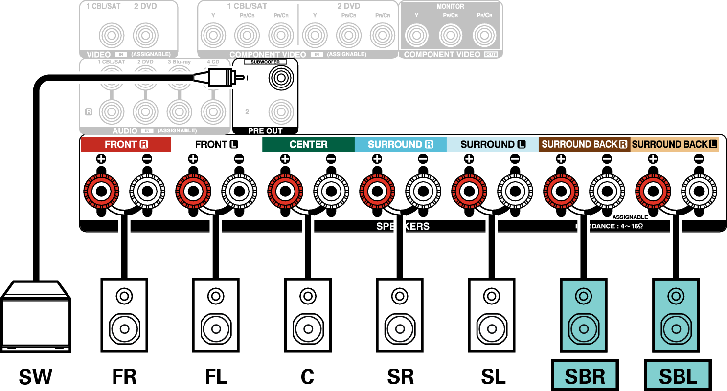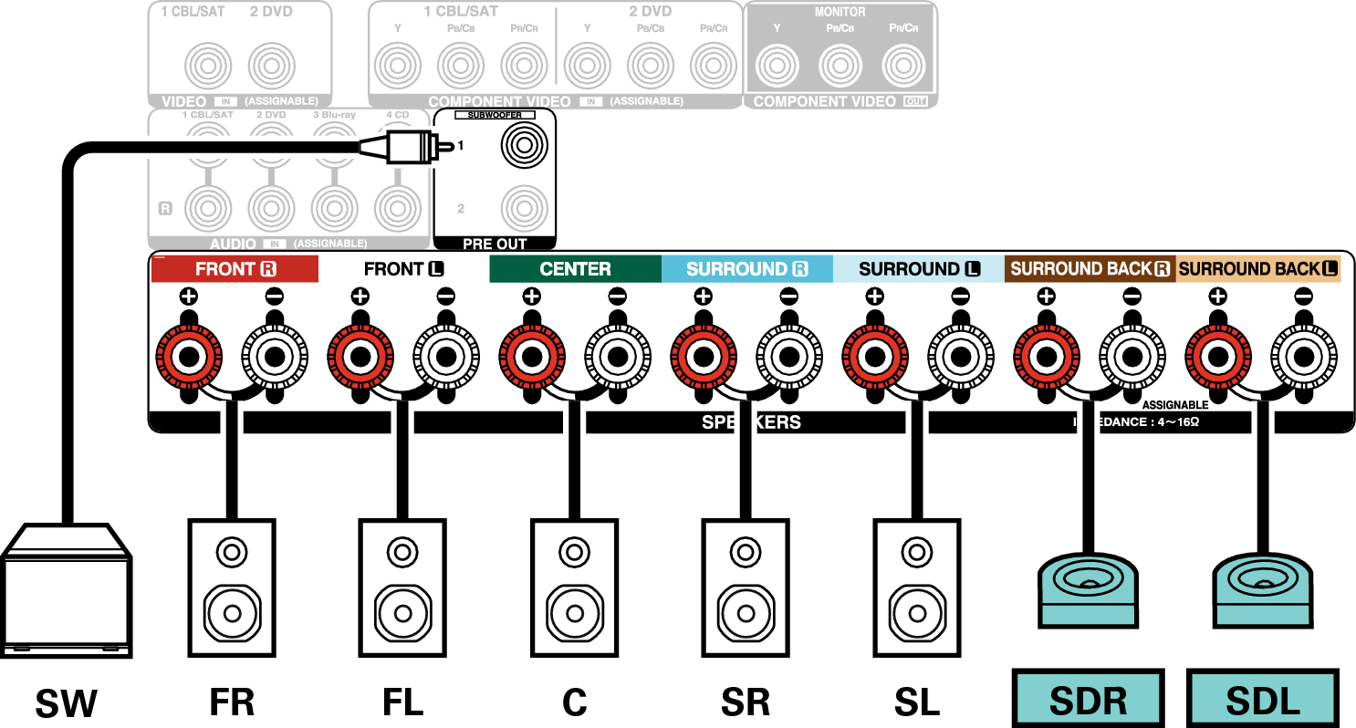 Si utiliza un solo altavoz surround trasero, conéctelo en el terminal SURROUND BACK L.