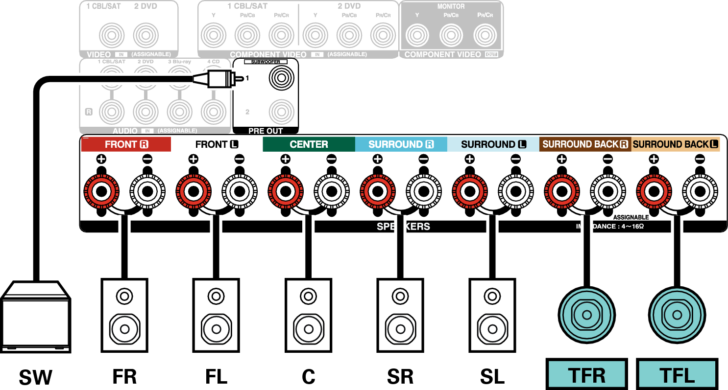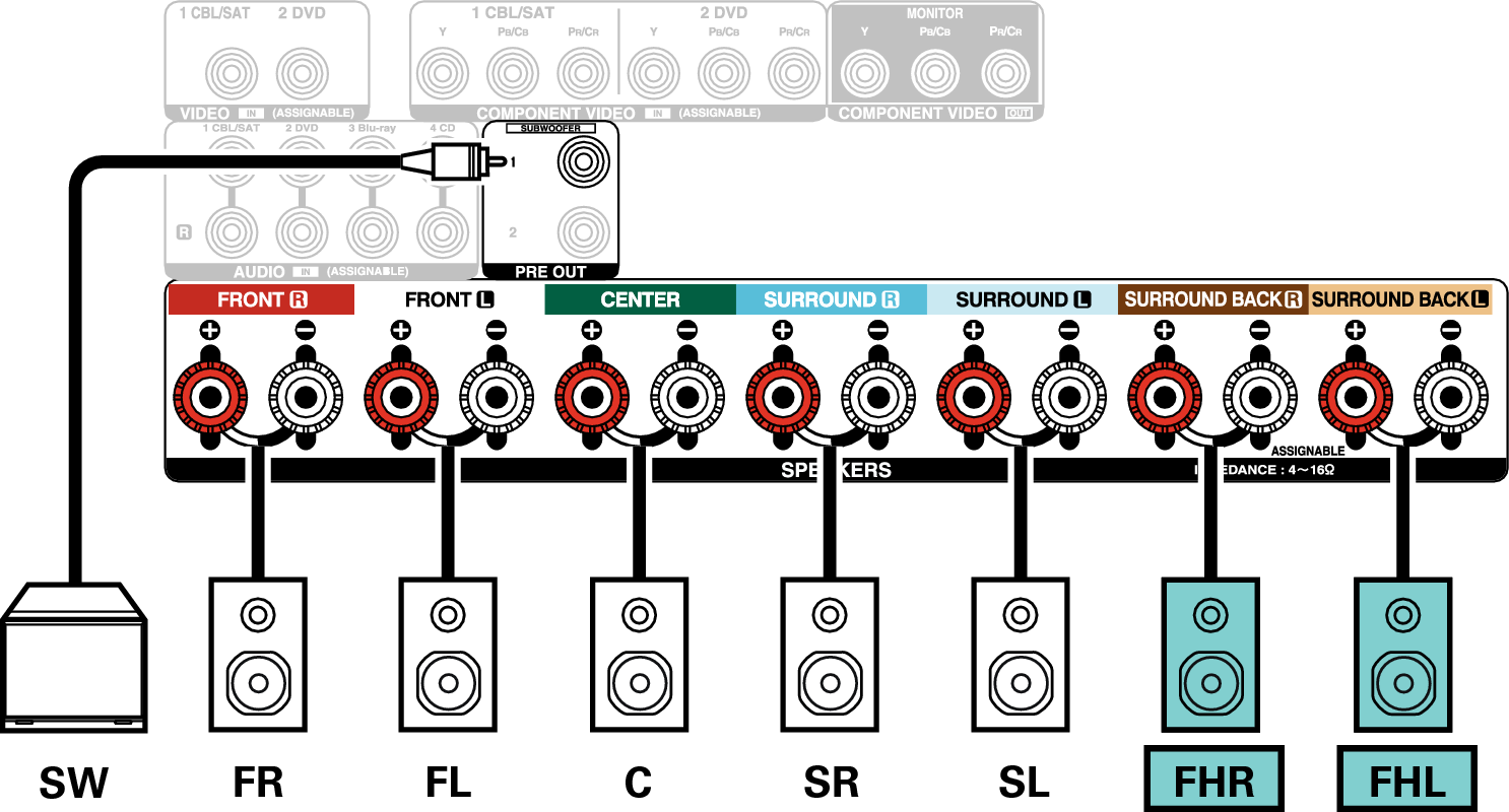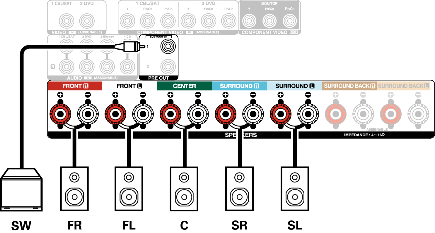 Si utiliza un solo altavoz surround trasero, conéctelo en el terminal SURROUND BACK L.