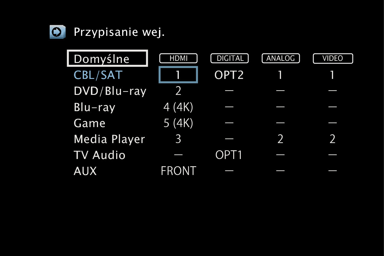 Należy zmienić przypisanie złącza wejściowego HDMI, złącza wejścia dźwięku cyfrowego, złącza wejściowego dźwięku analogowego i złącza wejściowego video, podczas podłączania źródła wejściowego, innego niż wydrukowane na złączach wejściowych audio/wideo tego urządzenia.