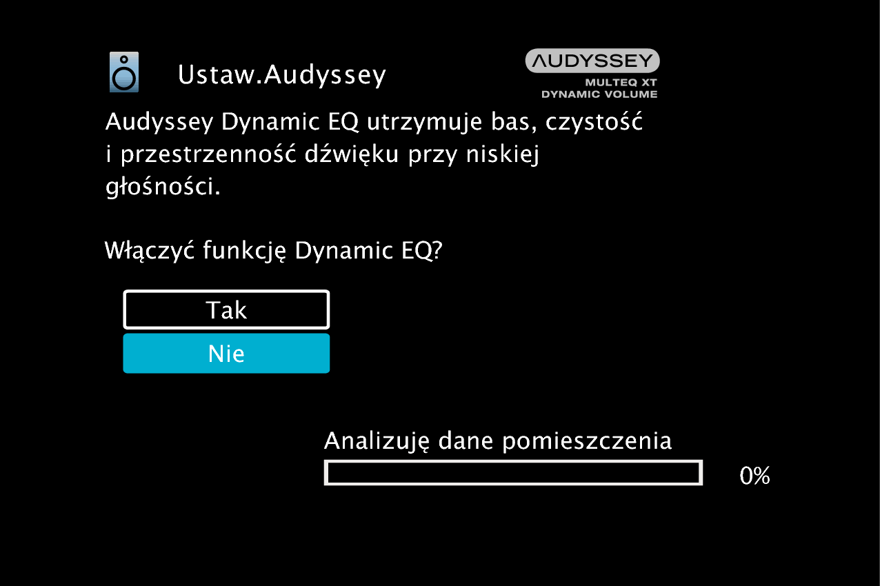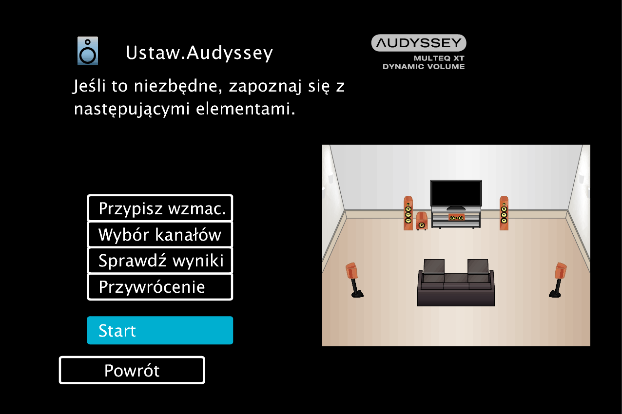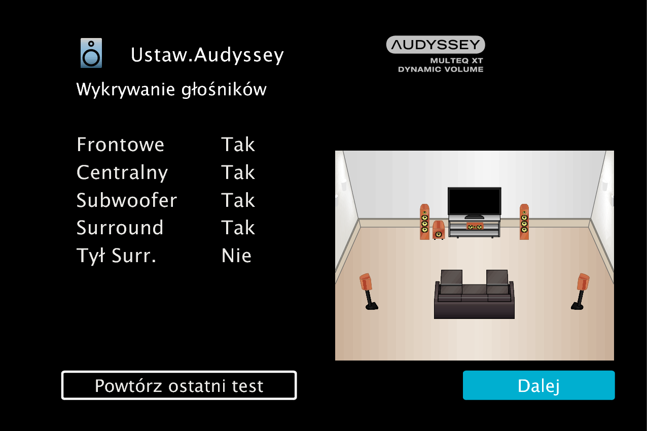Nie należy zmieniać podłączenia głośnika ani głośności subwoofera po instalacji Audyssey®. Jeśli zostały zmienione, należy ponownie przeprowadzić instalację Audyssey®, aby skonfigurować optymalne ustawienia korektora.