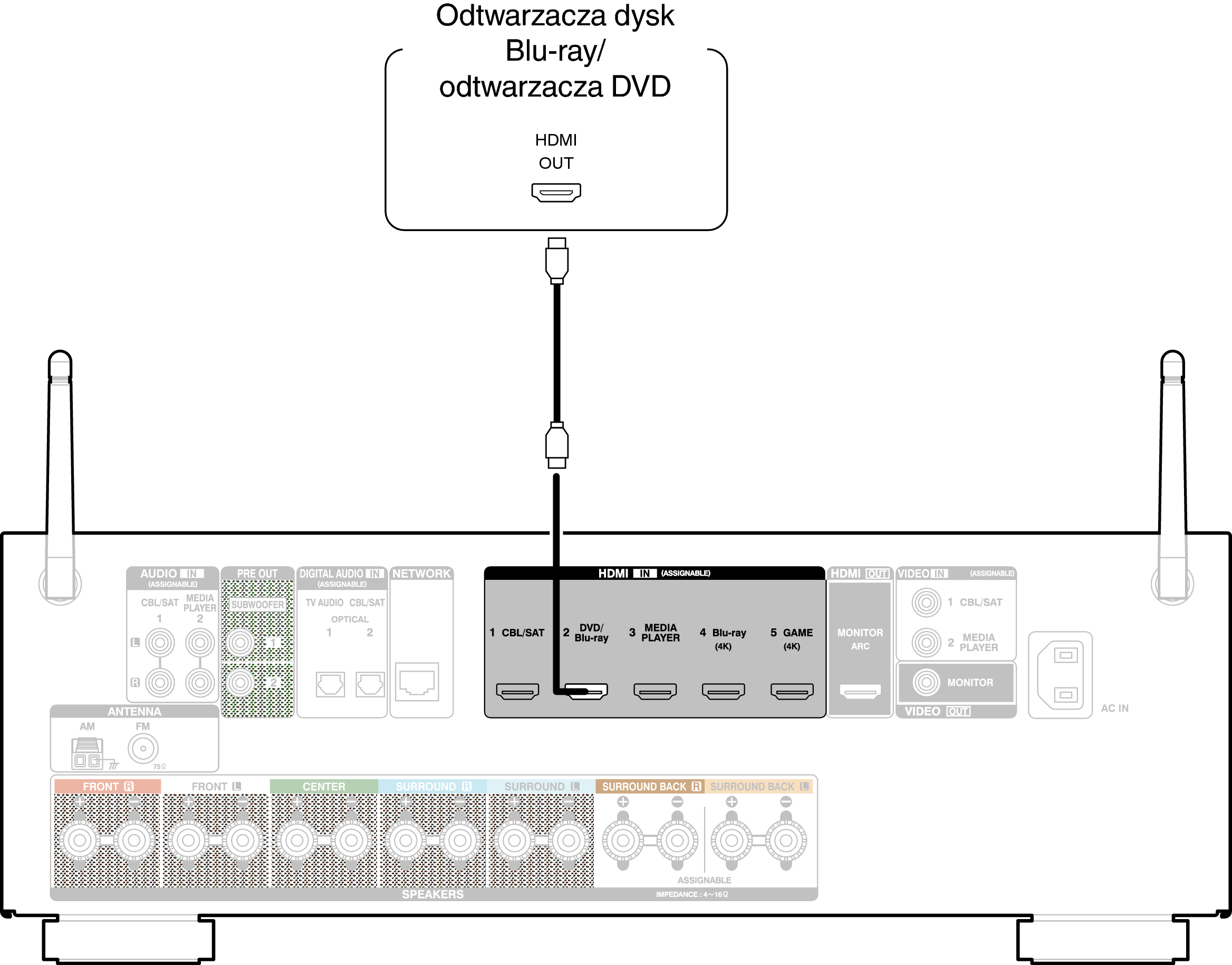 Odtwarzacz z obsługą rozdzielczości 4K należy podłączyć do złącza wejściowego HDMI 4 lub HDMI 5.