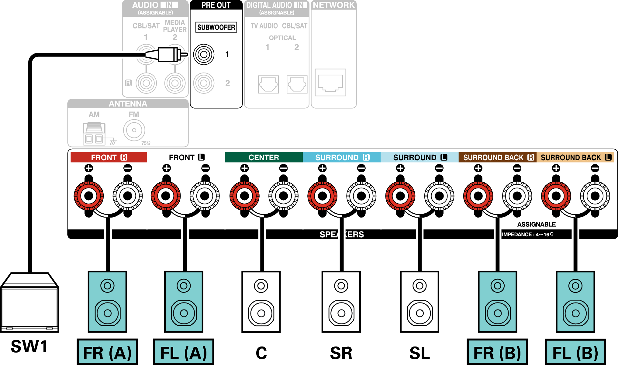 To urządzenie posiada wbudowany 7-kanałowy wzmacniacz mocy. Oprócz podstawowego systemu 5.1-kanałowego, rozmaite systemy, takie jak systemy 7.1-kanałowe, połączenia bi-amp i 2-kanałowe systemy dla odtwarzania wielostrefowego, mogą zostać skonfigurowane poprzez zmianę ustawień “Przypisanie wzmacniacz.”link, aby dostosować je do aplikacji.