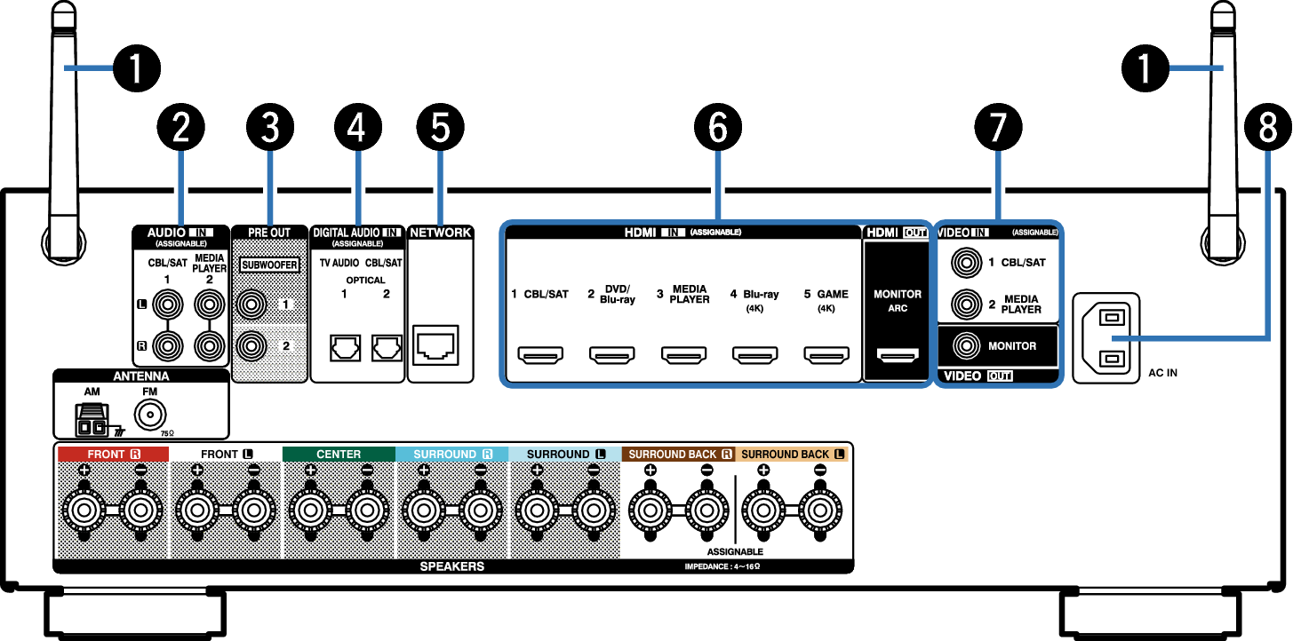 Nie dotykaj wewnętrznych szpilek w gniazdach na tylnym panelu. Ładunek elektrostatyczny przenoszony na ciele może spowodować uszkodzenie układów wewnętrznych tego urządzenia.