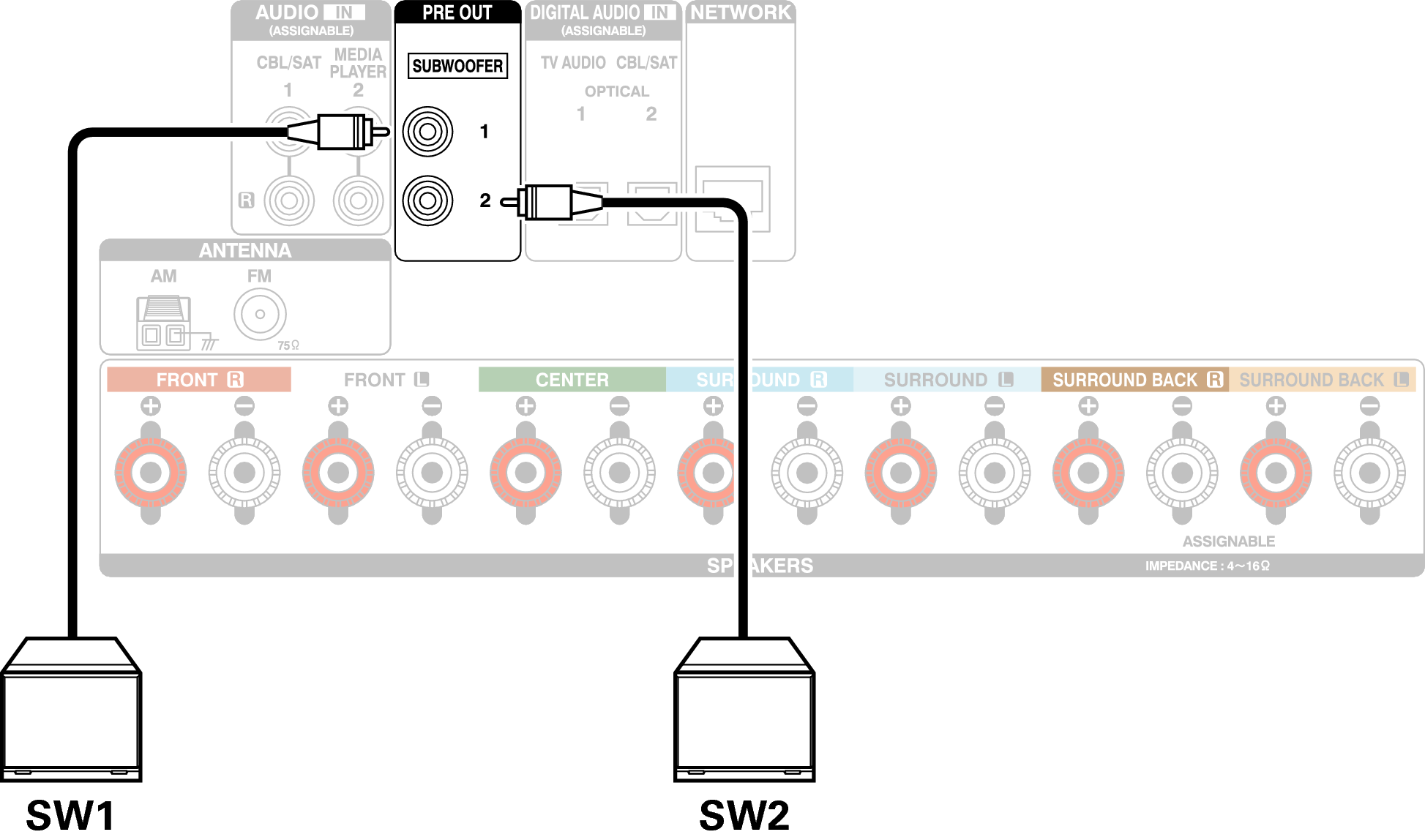 Чтобы подключить сабвуфер, воспользуйтесь кабелем для сабвуфера. К данному устройству можно подключить два сабвуфера.