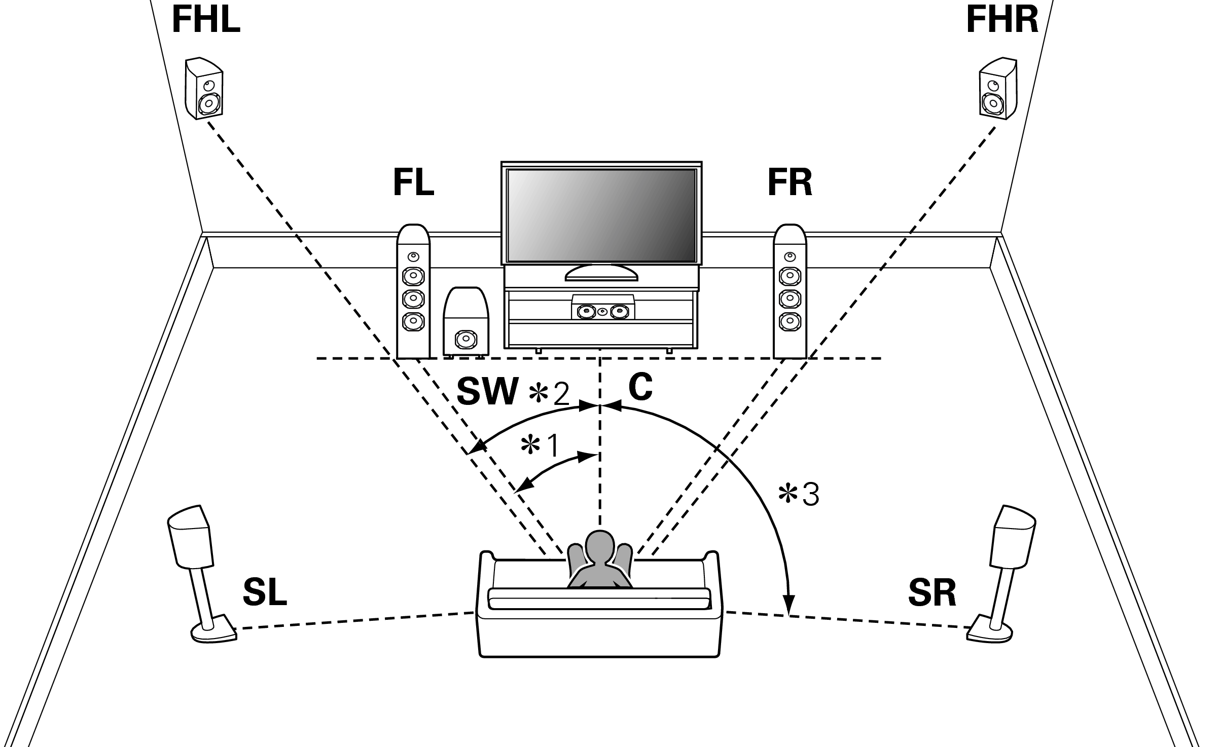 Placera vänster och höger FRONT-högtalare på samma avstånd från den huvudsakliga avlyssningspositionen. Avståndet mellan respektive högtalare och TV: n ska också vara detsamma. |