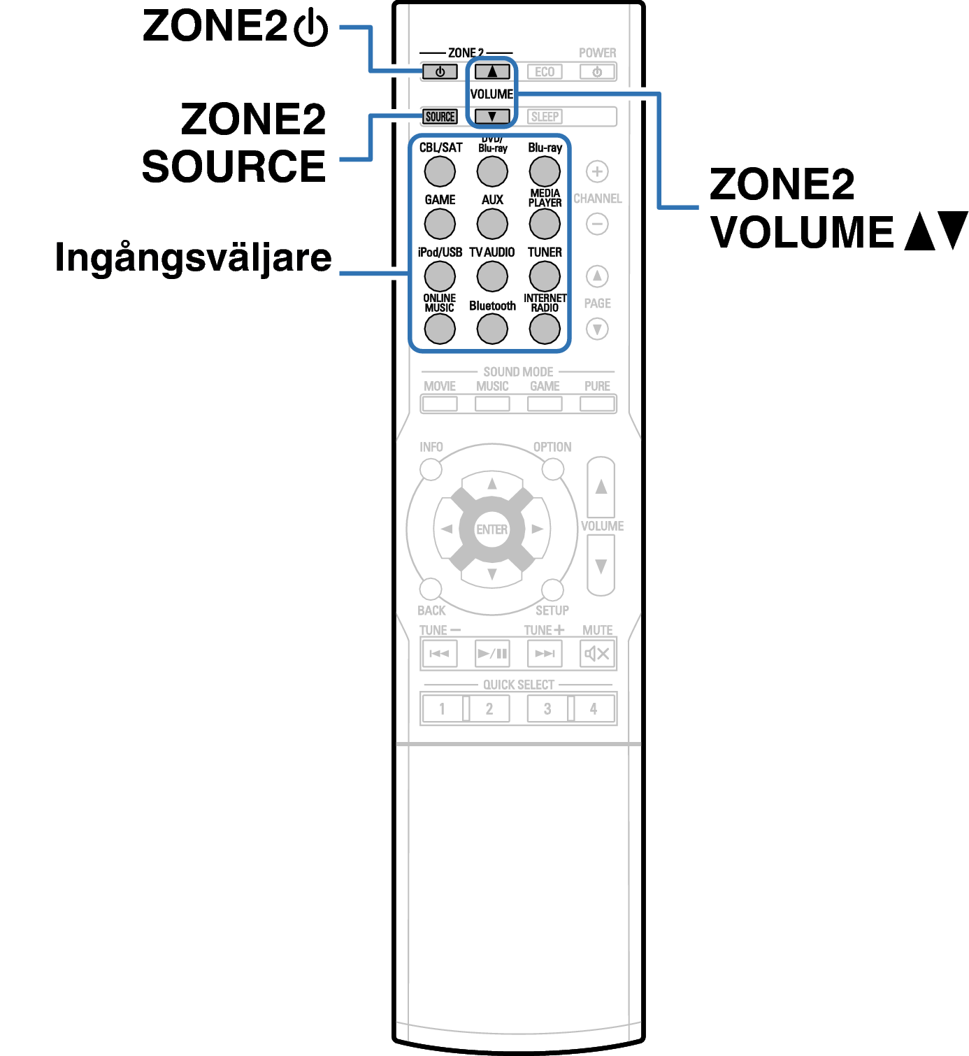 Tryck på ZONE2 SOURCE för att välja ingångskällan som ska spelas upp.