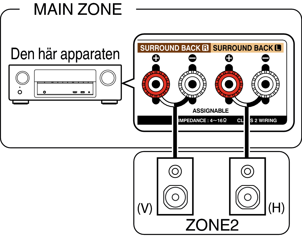 När “Tilldelningsläge”länk är inställd på “ZONE2” i menyn spelas ljudet till ZONE2 upp från högtalaruttagen till SURROUND BACK.