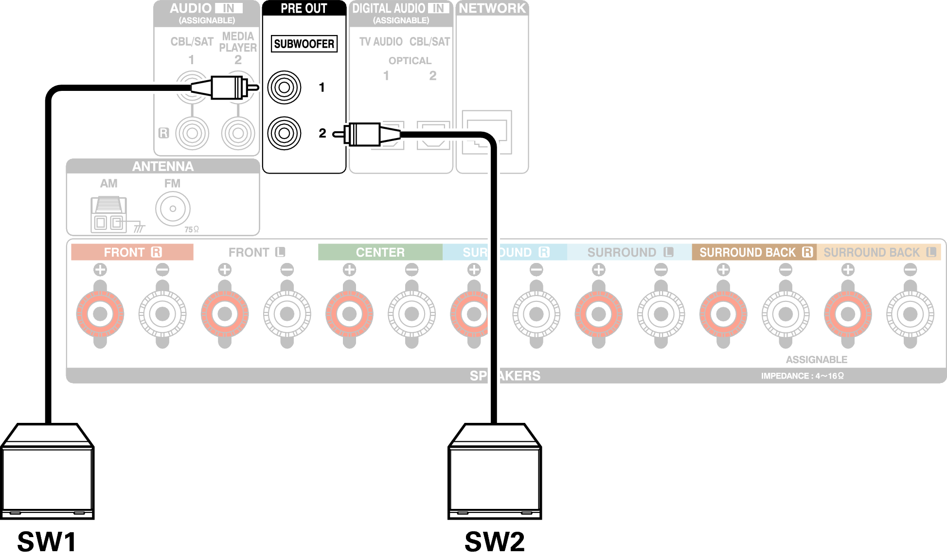 Über die jeweiligen Subwoofer-Anschlüsse wird dasselbe Signal ausgegeben.