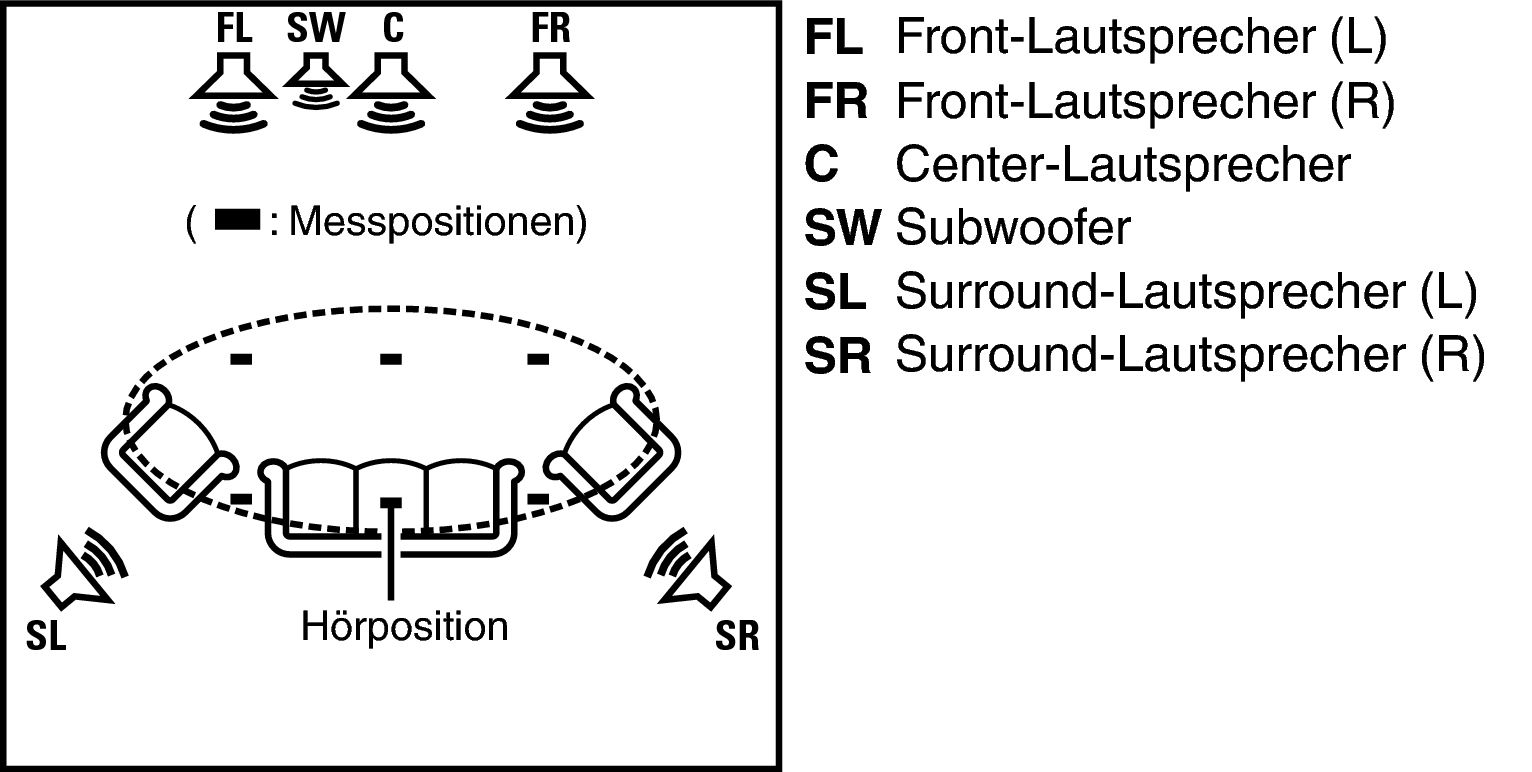 Audyssey MultEQ® XT verwendet die Messungen von dieser Position, um Lautsprecherabstand, Klangpegel, Polarität und den optimalen Übertragungswert des Subwoofers zu berechnen.