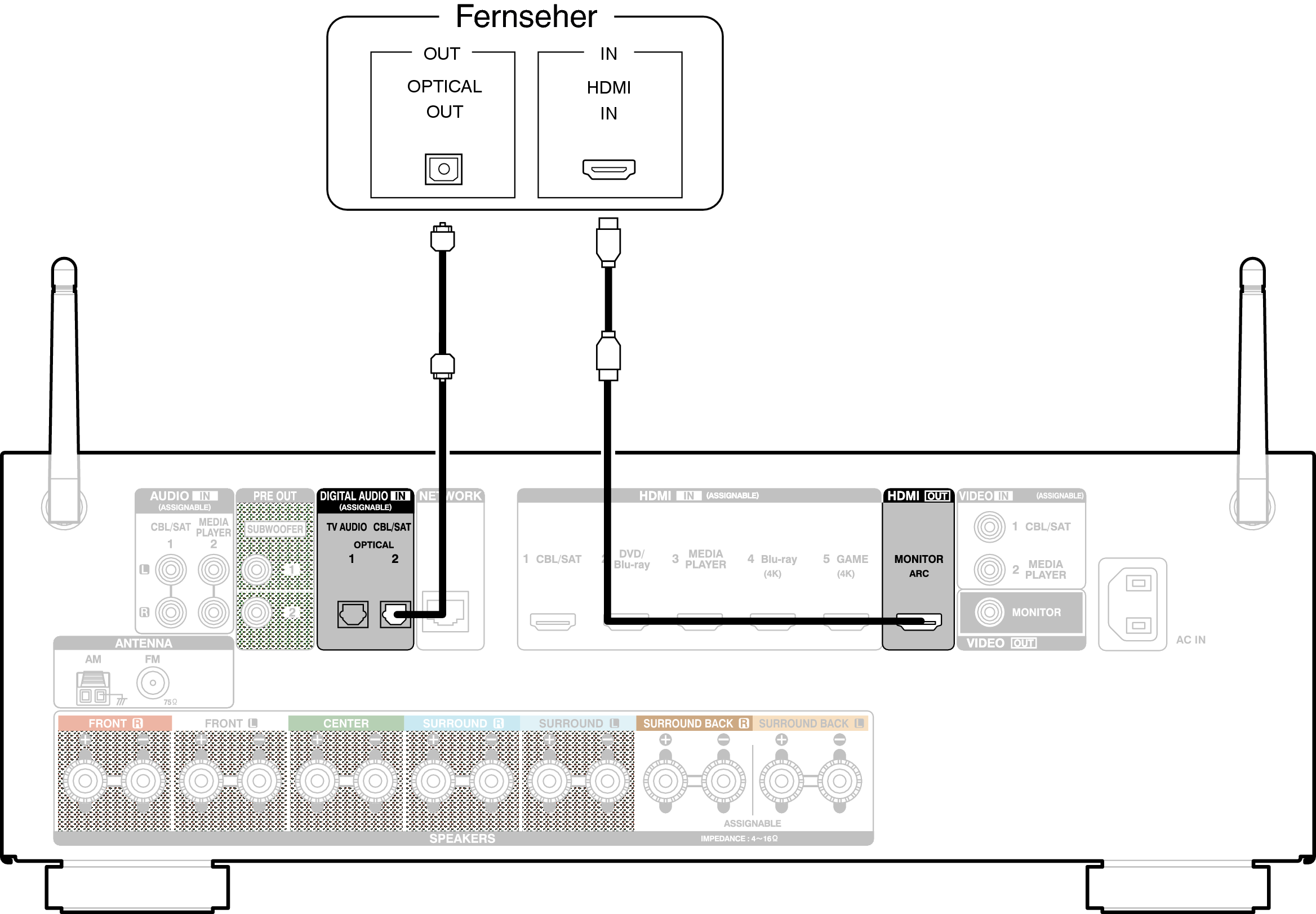 Um Audio des Fernsehers auf diesem Gerät wiederzugeben, schließen Sie den Fernseher über ein optisches Kabel an dieses Gerät an.