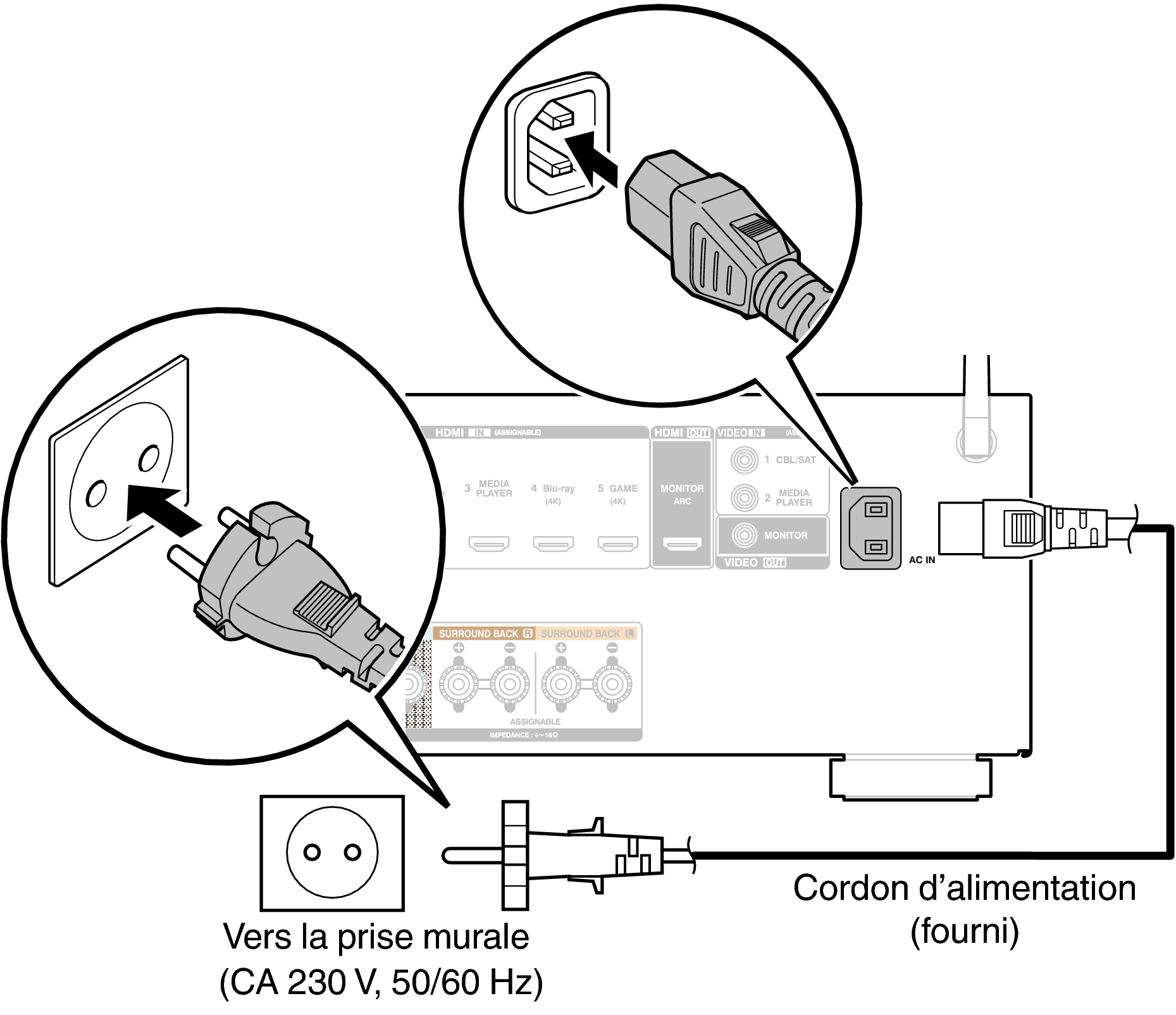 Une fois toutes les connexions effectuées, insérez la fiche d’alimentation dans la prise murale.