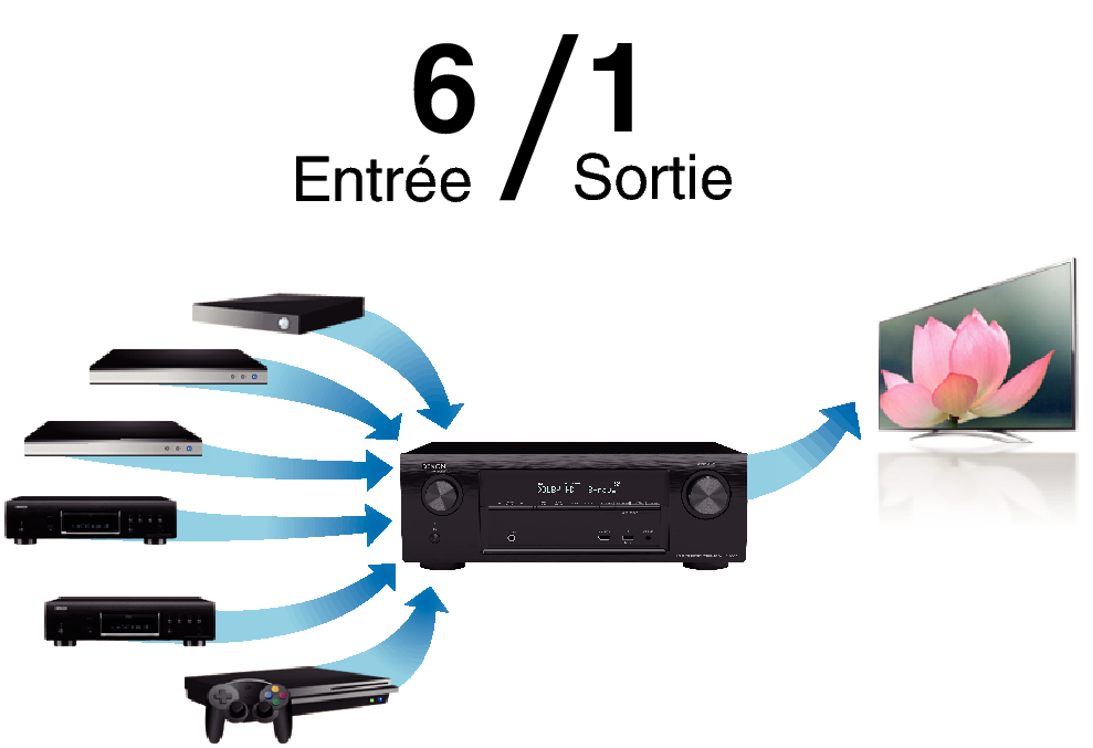 Cet appareil est équipé de 6 entrées HDMI et de 1 sortie HDMI permettant la connexion à divers appareils compatibles HDMI tels que des lecteurs Blu-ray Disc, des consoles de jeux et des caméscopes HD.