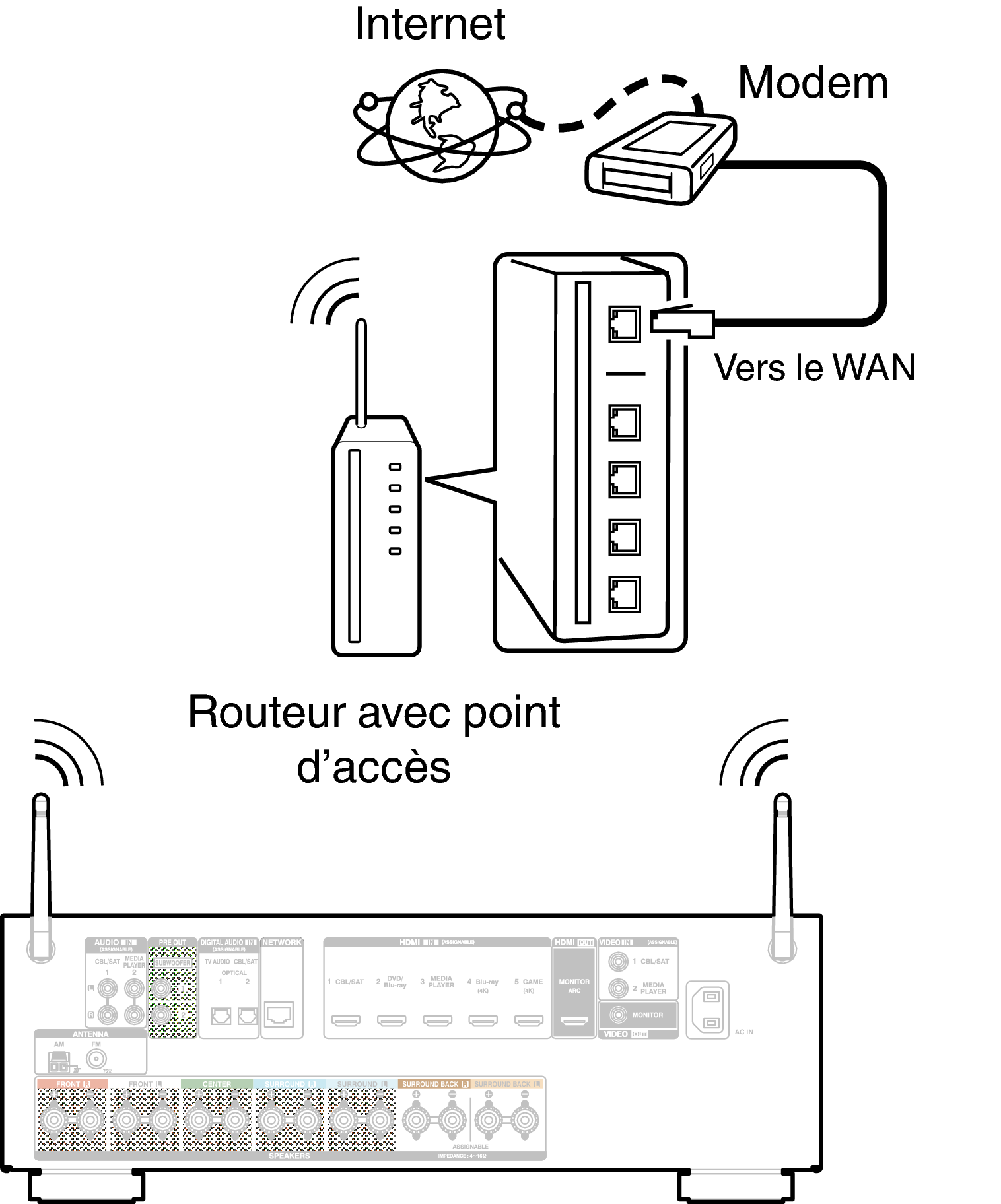 Ne connectez pas une borne NETWORK directement au port LAN/à la borne Ethernet de votre ordinateur.