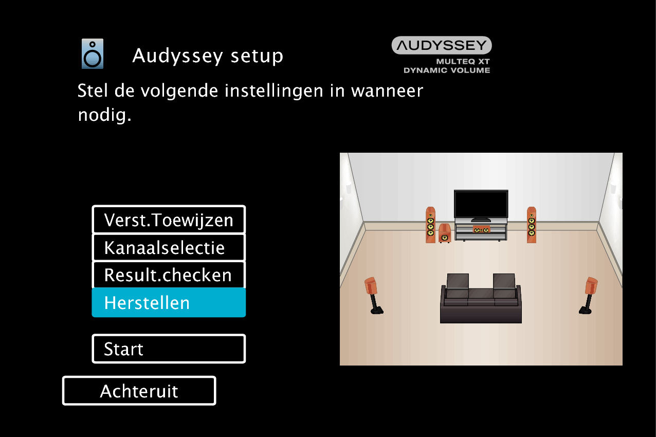 Als u “Herstellen” instelt op “Herstellen”, kunt u terugkeren naar het meetresultaat van de Audyssey® setup (waarde berekend bij de start via MultEQ® XT), zelfs als u elke instelling handmatig hebt gewijzigd.