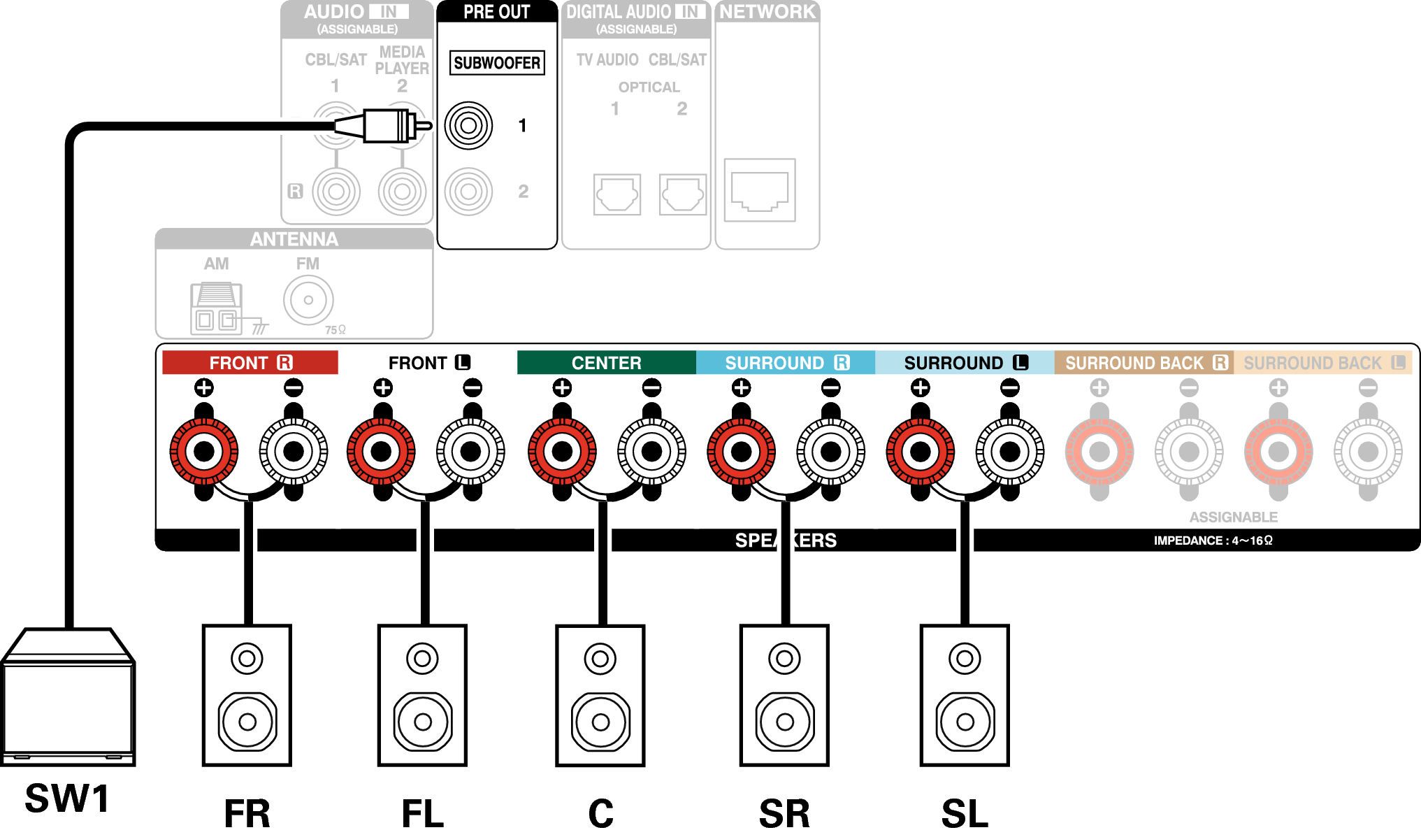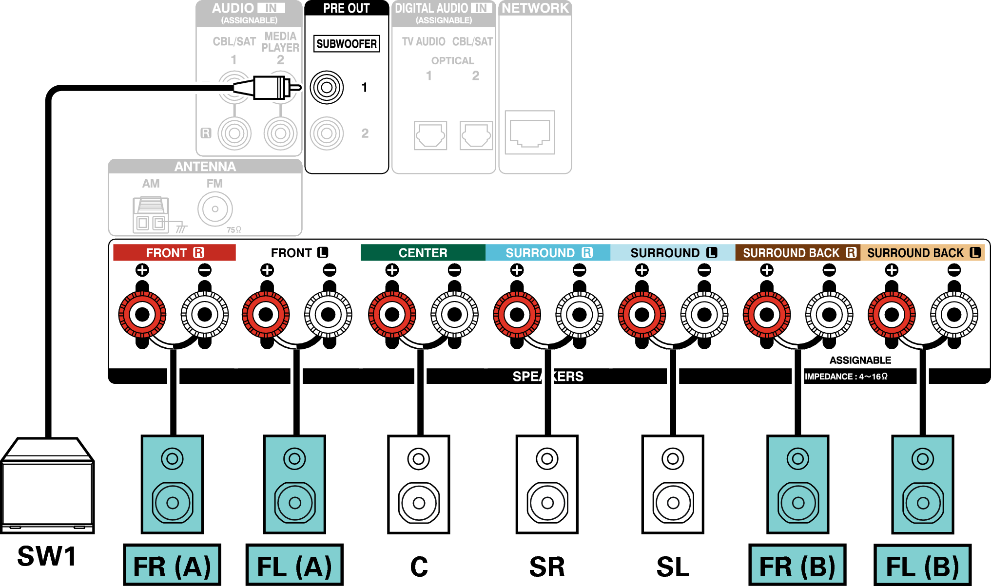 Deze aansluitmethode vormt een 5.1-kanaals luidsprekersysteem in de MAIN ZONE en een 2-kanaals systeem in ZONE2.