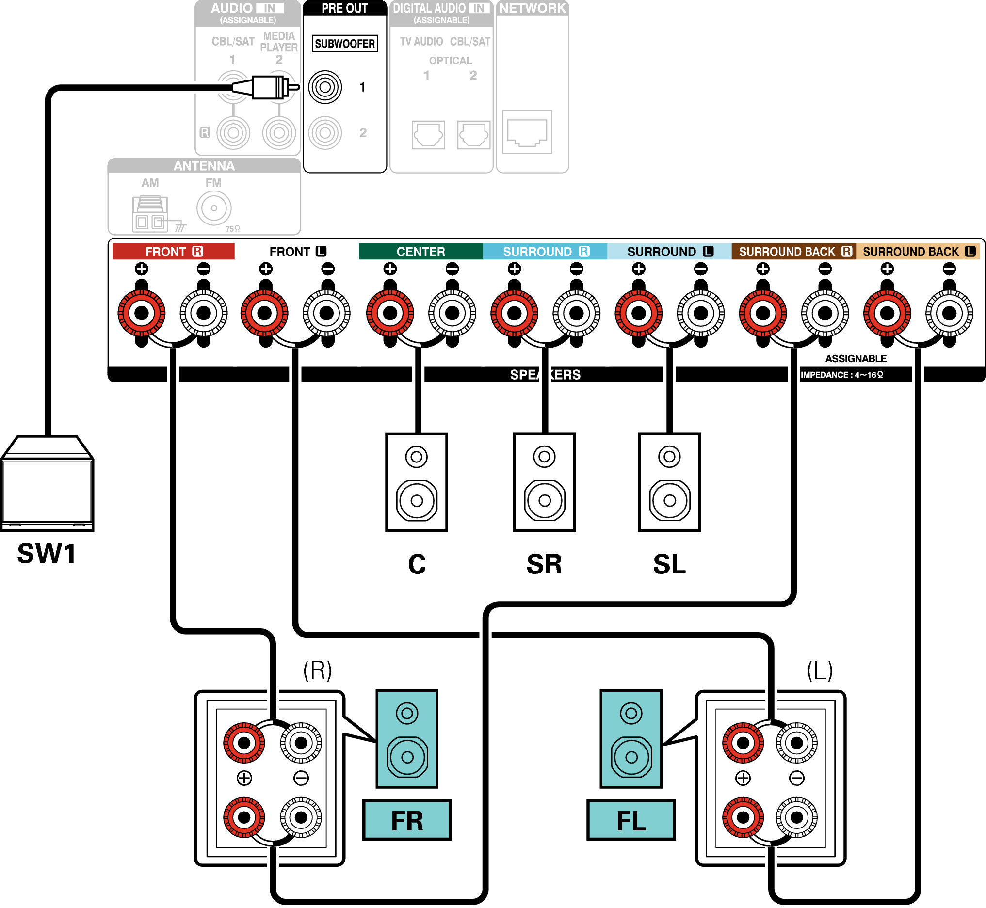Wanneer u één signaal surround achterluidspreker gebruikt, sluit u deze aan op de SURROUND BACK L-aansluiting.