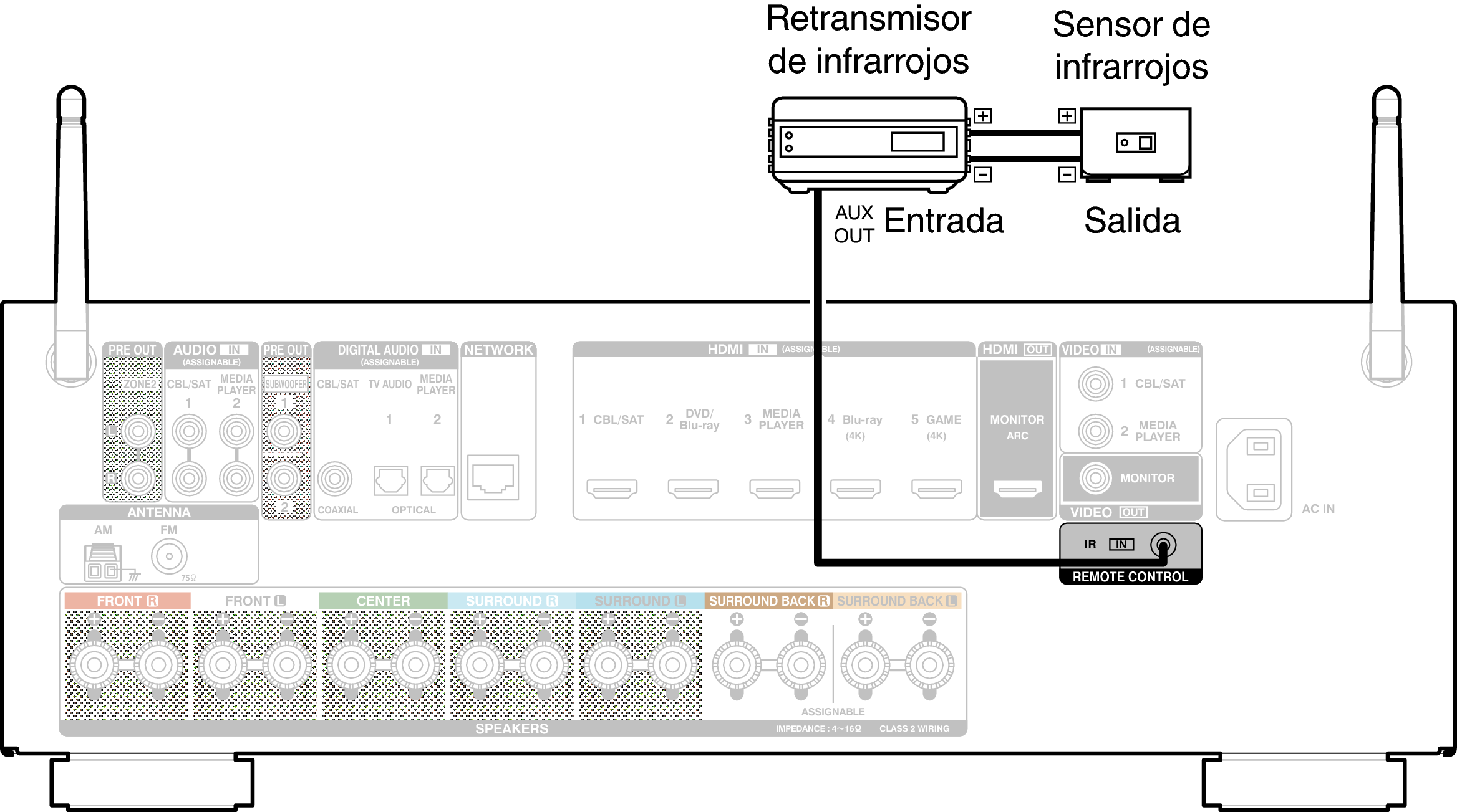 Cuando esta unidad está instalada en una ubicación donde las señales del mando a distancia no llegan (instalación en un mueble, etc.), todavía puede ser controlada por el mando a distancia conectando una unidad receptora de mando a distancia (vendida por separado).