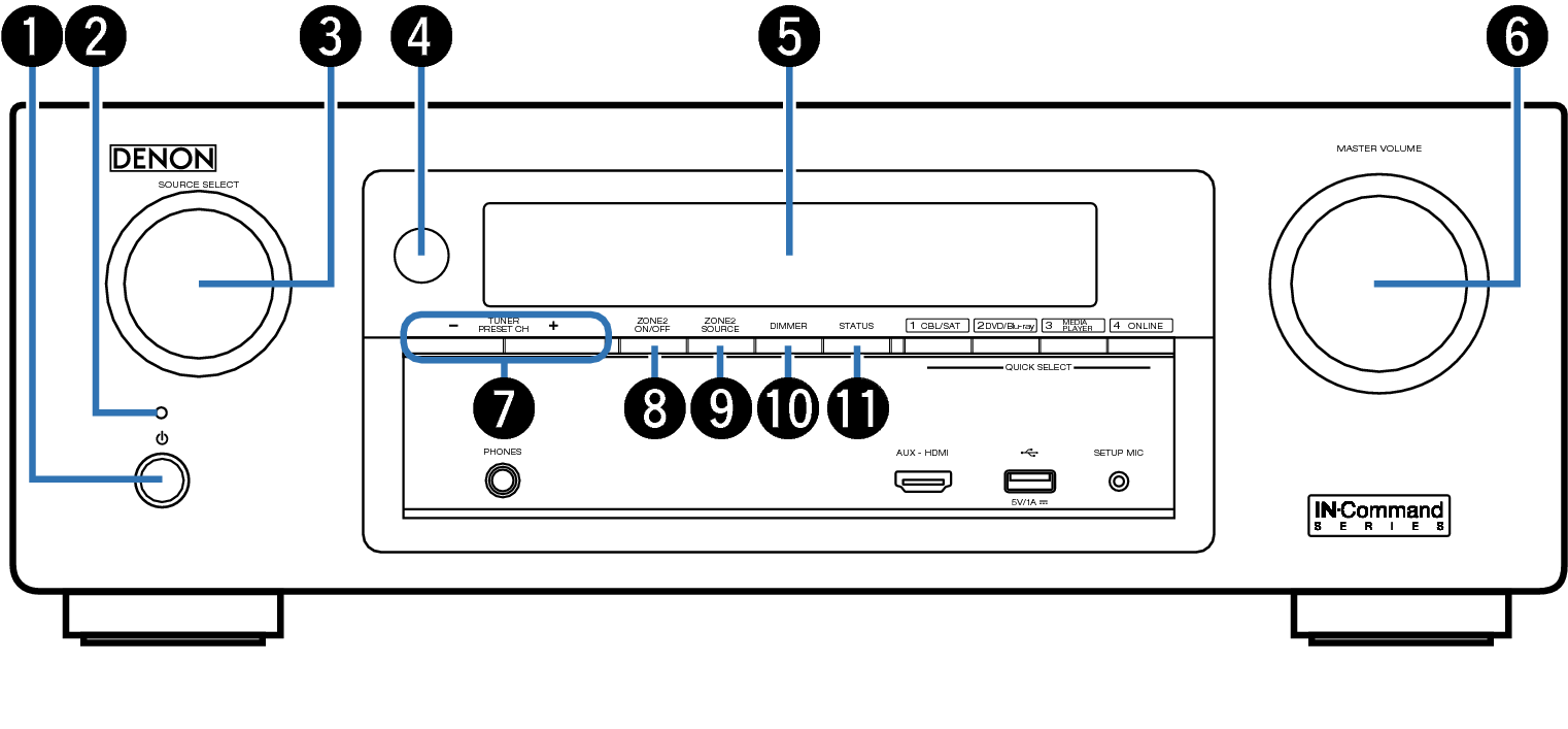 Con una sola pulsación de estos botones, puede recuperar diversos ajustes que haya registrado en cada botón, como, por ejemplo, los ajustes de fuente de entrada, nivel de volumen y modo de sonido. enlace