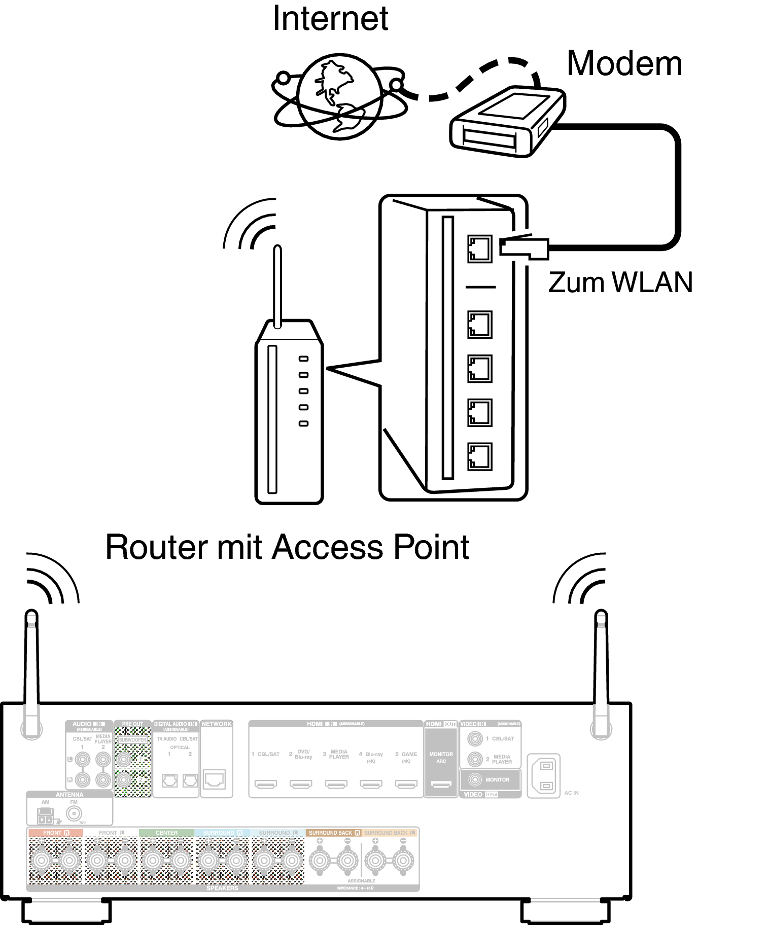 Der NETWORK-Stecker darf nicht direkt mit dem LAN-Anschluss/Ethernet-Anschluss Ihres Computers verbunden werden.