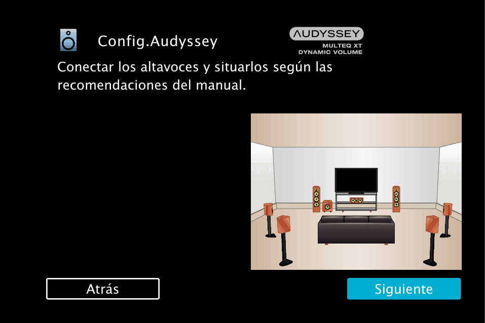 No cambie la conexión de los altavoces o el volumen del subwoofer después de “Config Audyssey®”. Si se cambia, realice “Config Audyssey®” otra vez para obtener el efecto de corrección óptimo del ecualizador.