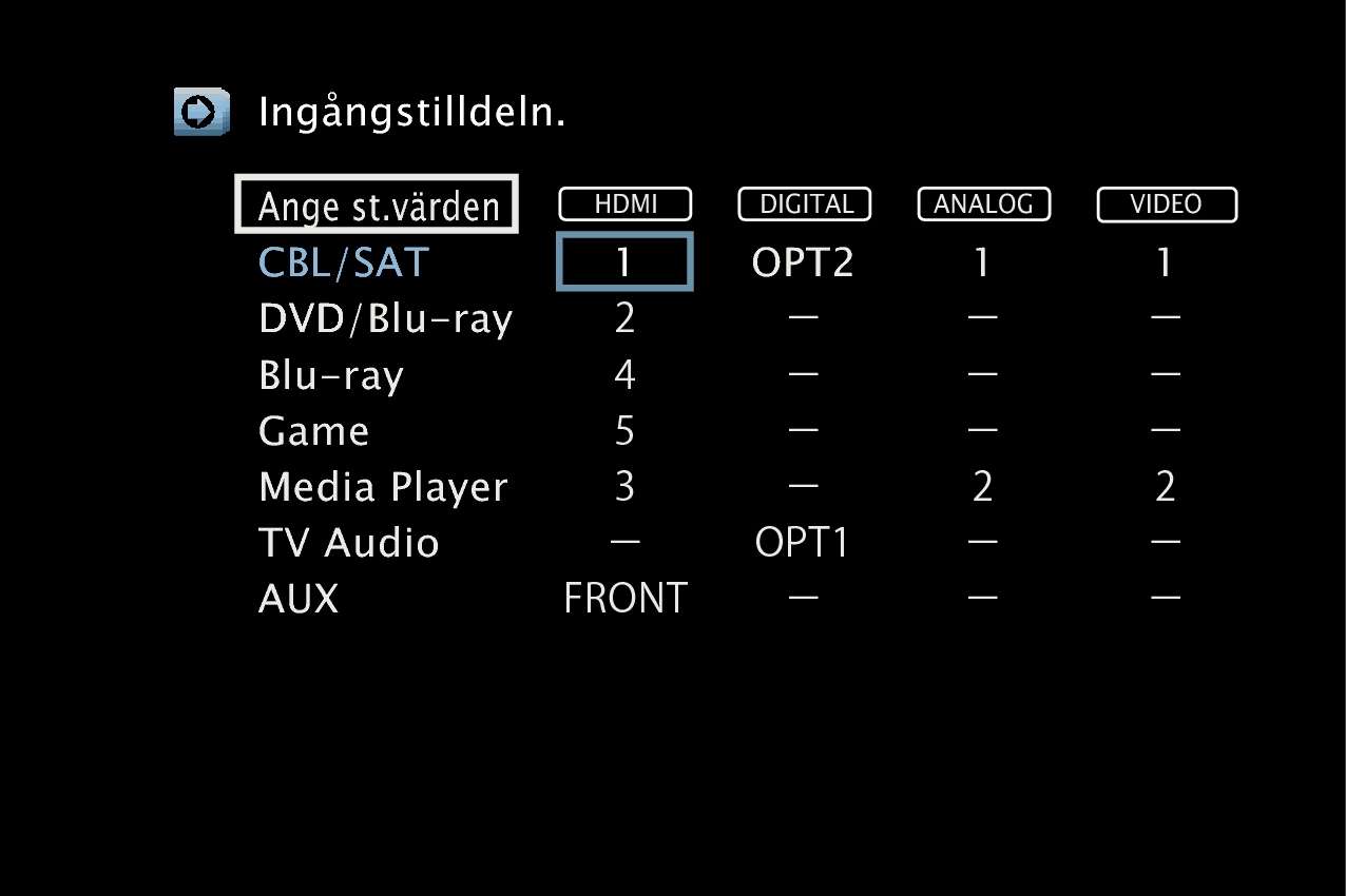 Ändra tilldelningen av HDMI-ingångsanslutningen, anslutningen för digitalt ljud, anslutningen för analogt ljud och anslutningen för video om du ansluter en källa som inte överensstämmer med vad som står på ingångsanslutningen för ljud/bild på den här enheten.