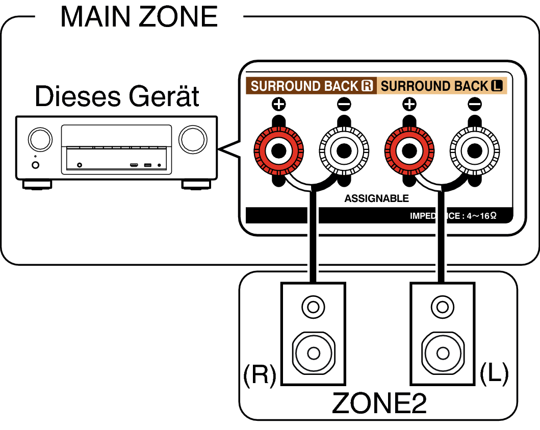 Wenn “Zuweisung” im Menü auf “ZONE2” eingestellt ist, erfolgt die Audioausgabe in ZONE2 über den SURROUND BACK-Lautsprecheranschluss. Link