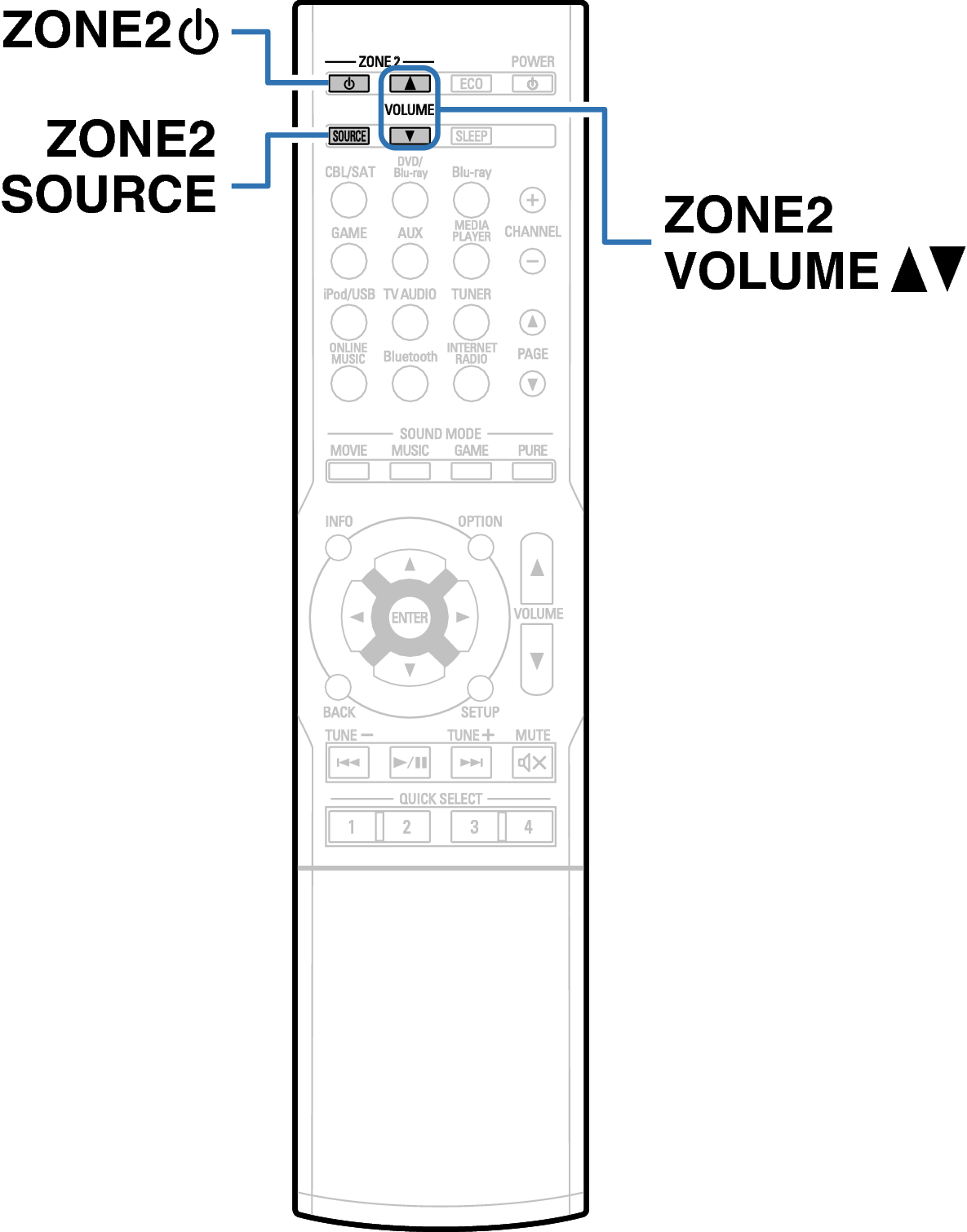 Pour effectuer une opération avec l’appareil principal, appuyez sur ZONE2 SOURCE. Chaque fois que vous appuyez sur ZONE2 SOURCE, la source d’entrée change.