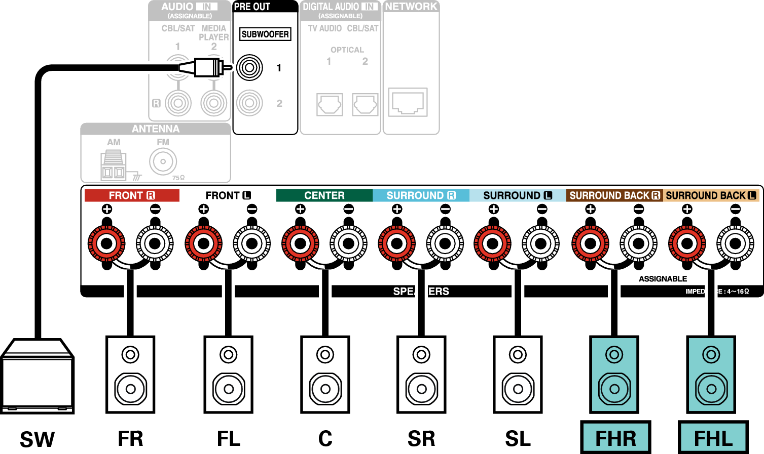 Cet appareil est équipé d’un amplificateur de puissance de canal 7. En plus du système du canal 5.1 de base, une variété de systèmes d’enceinte peut être configurée en changeant les paramétrages de “Affect.Amplis” en fonction de l’application, par exemple les systèmes du canal 5.1, les connexions bi-amplificateur et les systèmes à 2 canaux pour la lecture multizone. lien