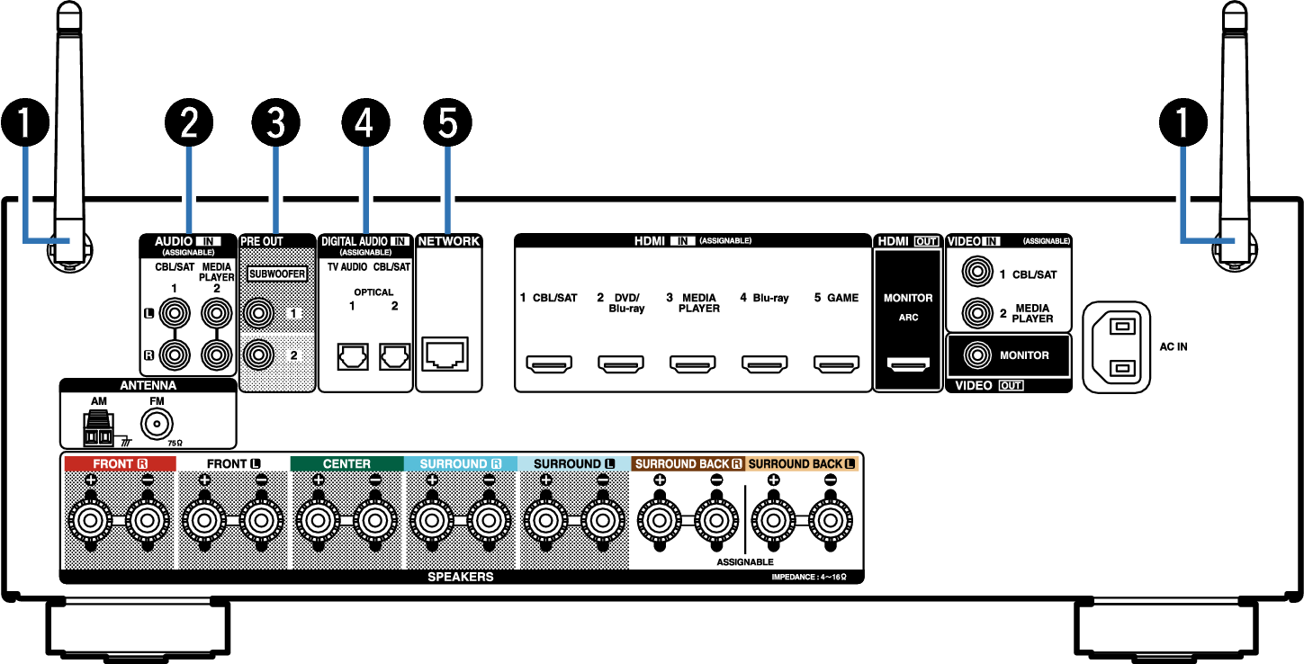 Ne touchez pas les broches internes des connecteurs sur le panneau arrière. Une éventuelle décharge électrique pourrait endommager de façon permanente votre appareil.