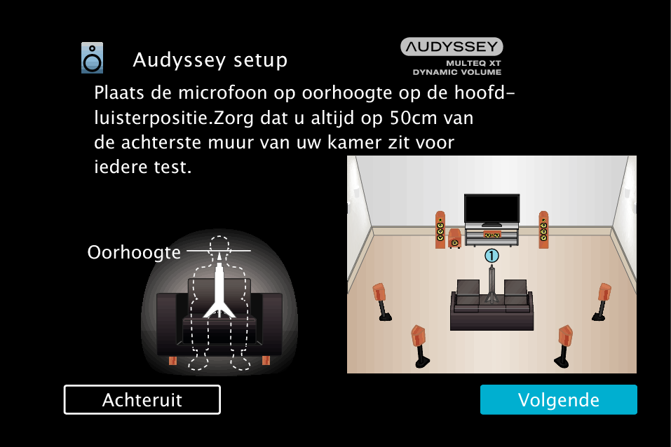 Wijzig de luidsprekeraansluiting of het subwoofervolume niet na de Audyssey® Setup. Als deze worden gewijzigd, voert u Audyssey® Setup opnieuw uit om de optimale equalizerinstellingen te configureren.