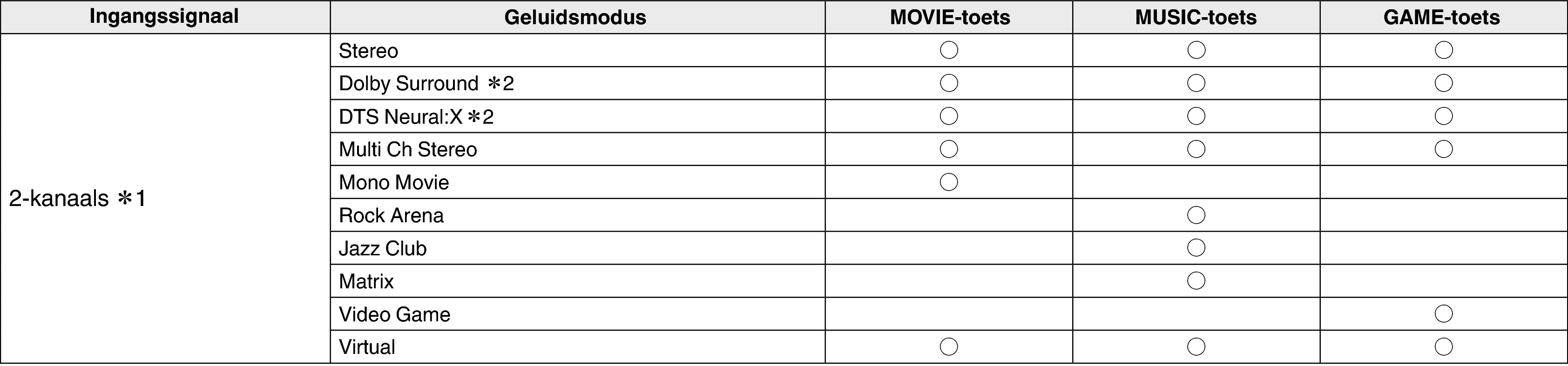 De geluidsmodus die kan worden geselecteerd, verschilt afhankelijk van het audioformaat van het ingangssignaal en het aantal kanalen. Zie De typen ingangssignaal en de bijbehorende geluidsmodikoppeling voor meer informatie.