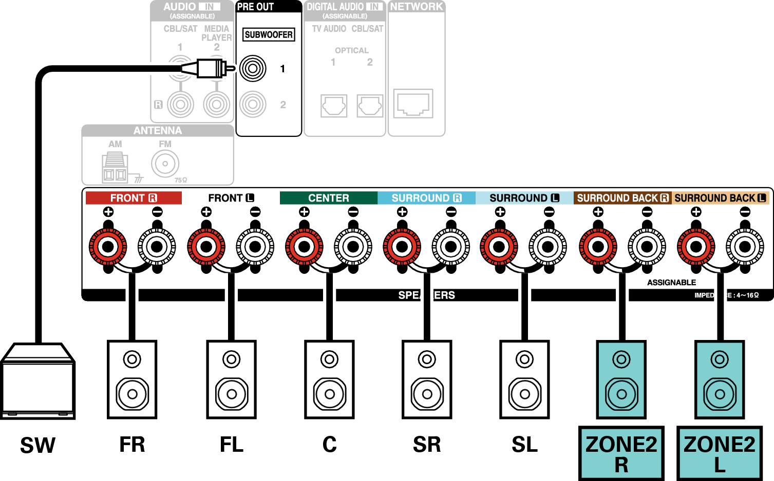 Deze aansluitmethode vormt een 5.1-kanaals luidsprekersysteem in de MAIN ZONE en een 2-kanaals systeem in ZONE2.