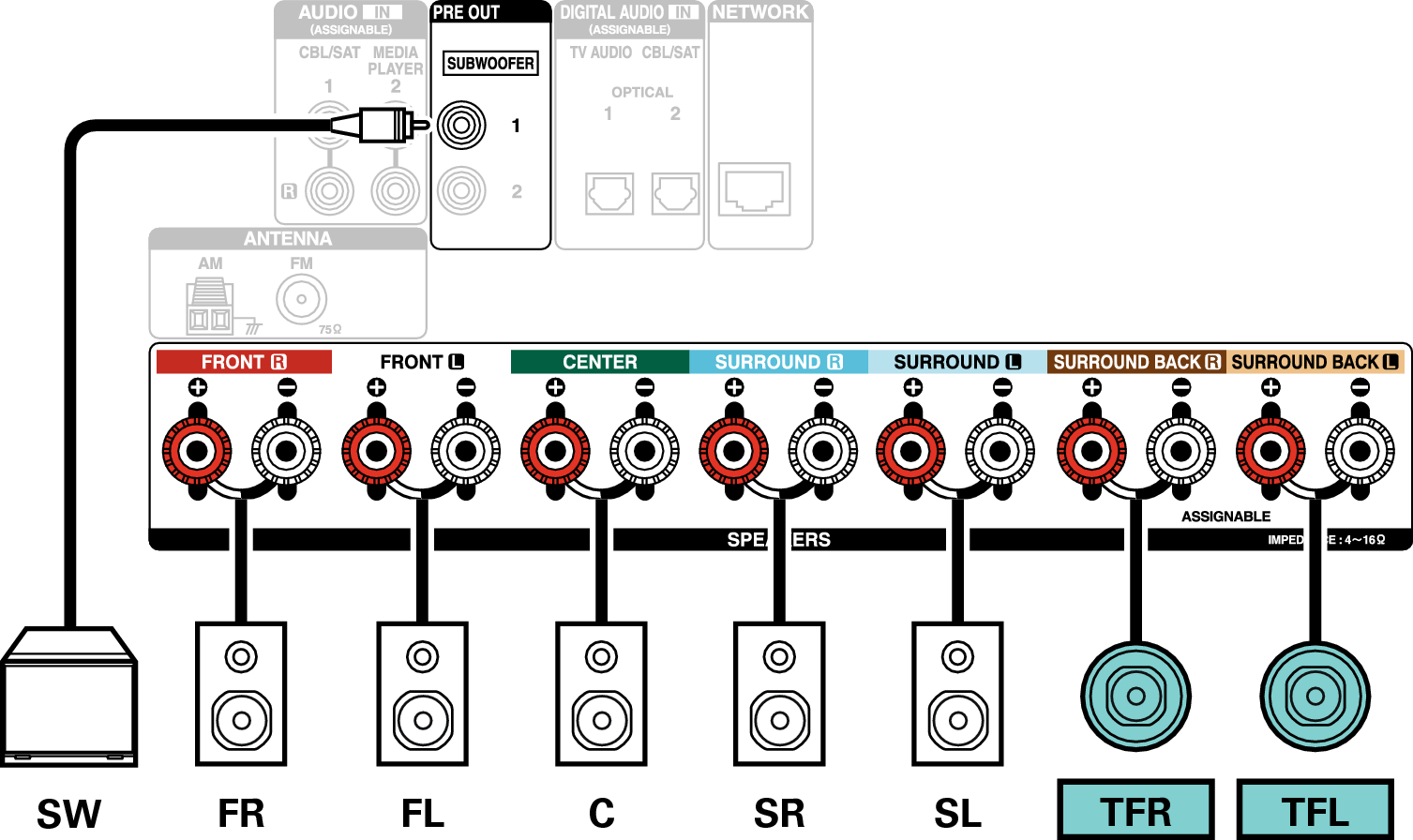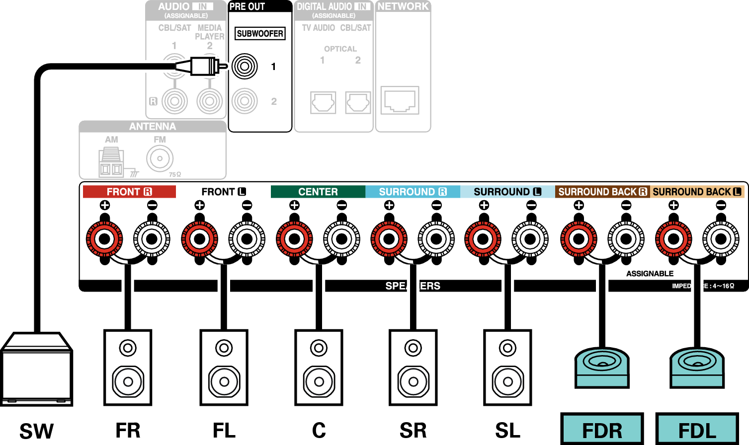 Dit toestel heeft een ingebouwde 7-kanaals stroomversterker. Naast het standaard 5.1-kanaals systeem, kunnen verschillende luidsprekersystemen worden geconfigureerd door de instellingen voor “Verst.Toewijzen” te wijzigen volgens de toepassing, zoals 5.1-kanaals systemen, bi-amp-aansluitingen en 2-kanaals systemen voor multizone-weergave. koppeling