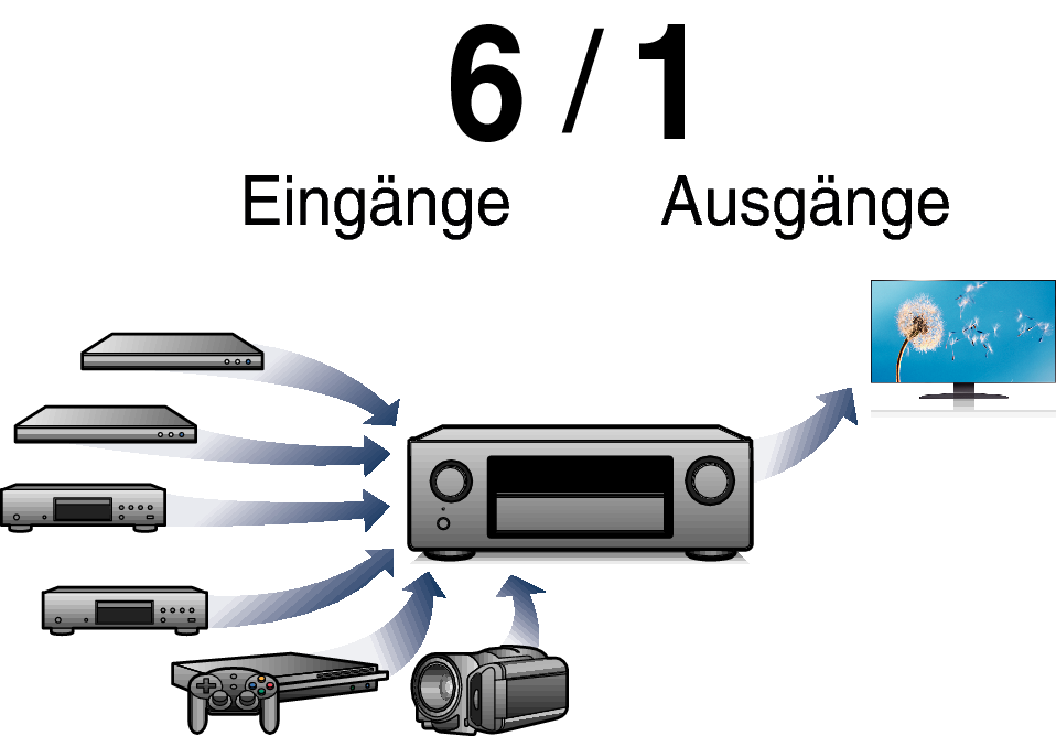 Dieses Gerät verfügt über 6 HDMI-Eingänge und 1 HDMI-Ausgänge, die Verbindungen mit verschiedenen HDMI-kompatiblen Geräten wie Blu-ray Disc-Playern, Spielekonsolen und HD-Videokameras ermöglichen.