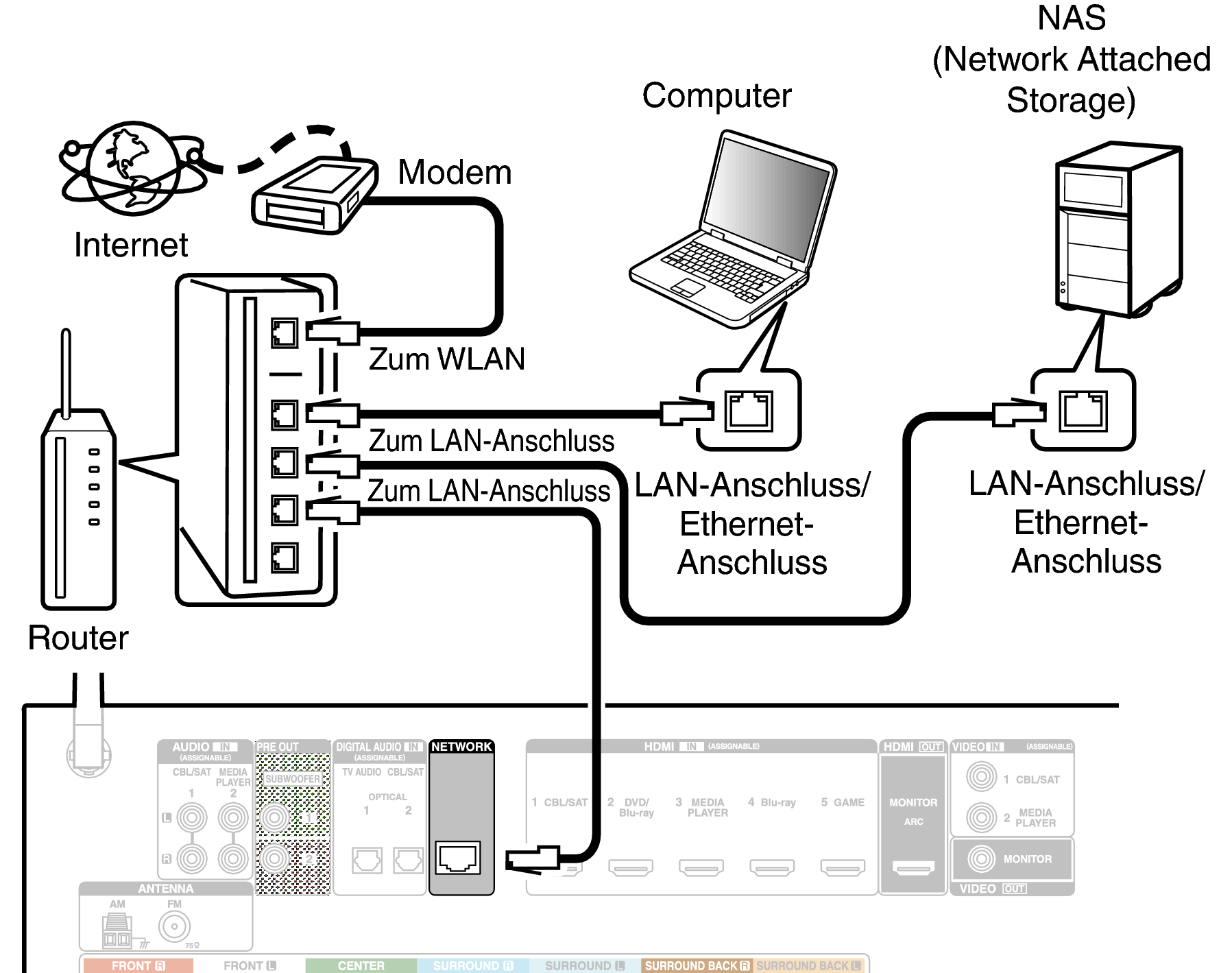 Für den Anschluss über ein kabelgebundenes LAN verbinden Sie den Router über ein LAN-Kabel mit diesem Gerät, wie in der nachstehenden Abbildung dargestellt.