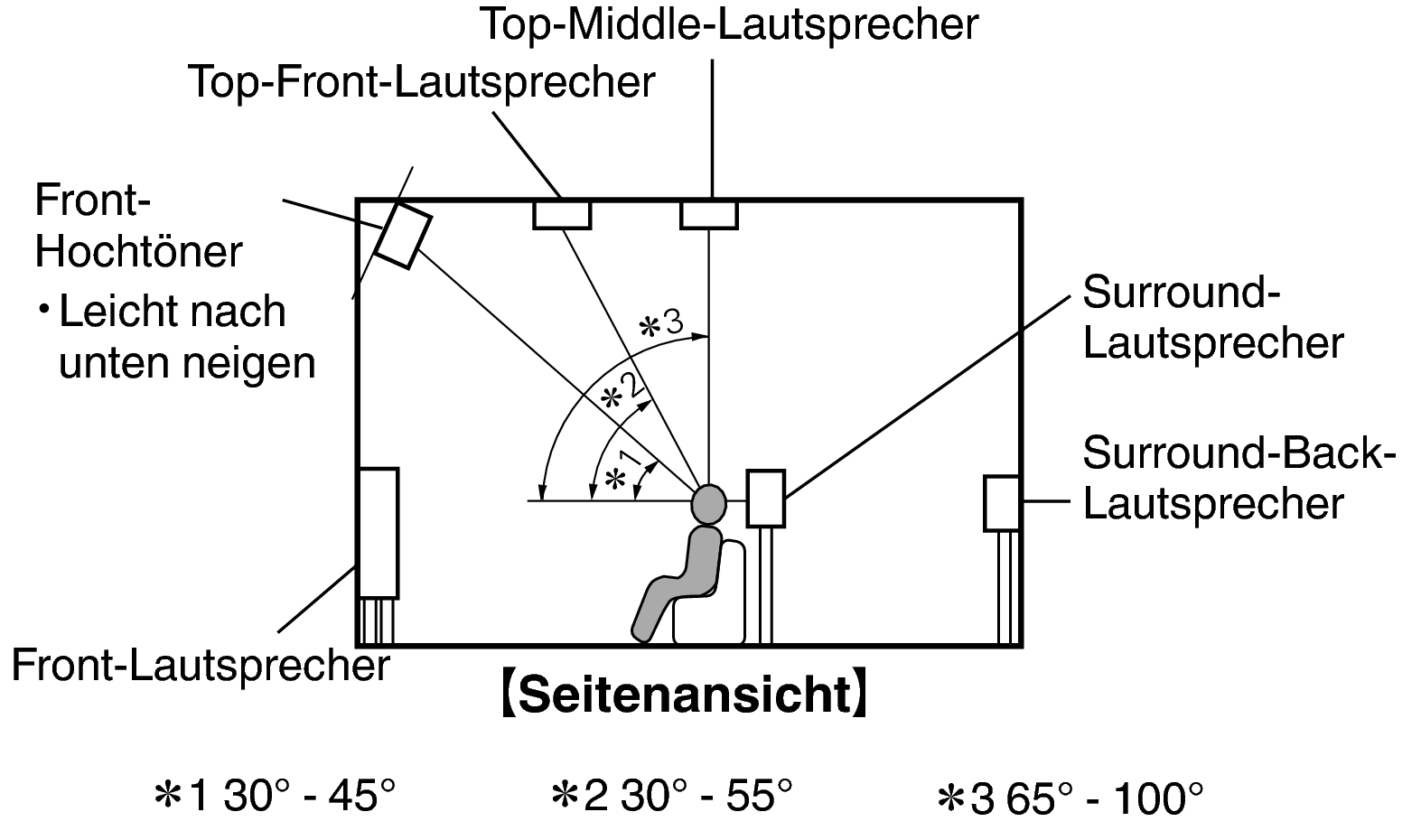 Platzieren Sie den linken und rechten Fronthochtöner direkt oberhalb der Front-Lautsprecher. Befestigen Sie diese so dicht wie möglich unter der Decke, und richten Sie sie auf die Haupthörposition aus. |
