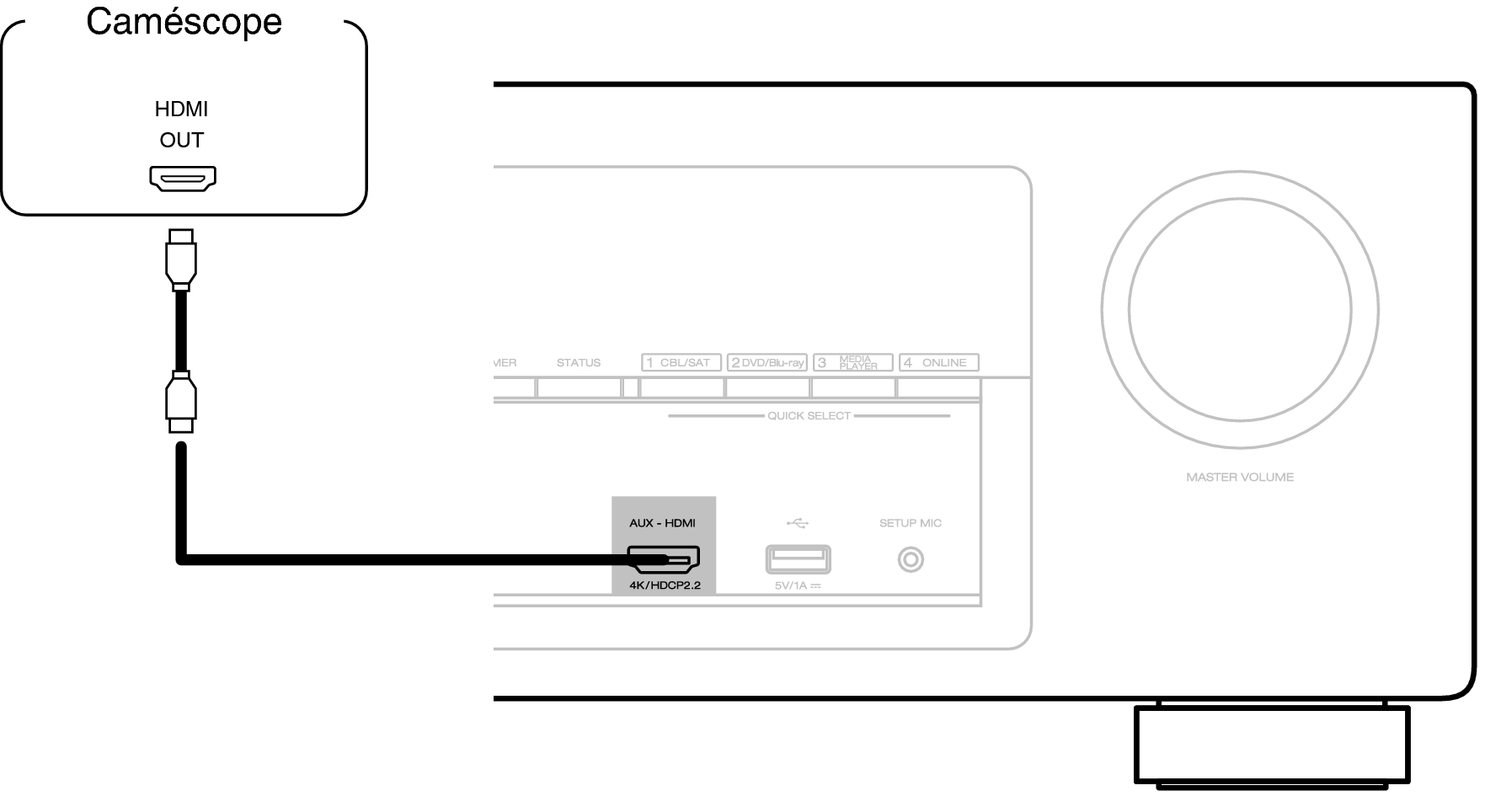 Le signal vidéo 4K 60/50 Hz ne peut pas être reçu sur cette connexion s’il utilise un format autre que YCbCr 4:2:0. Si votre dispositif de lecture ne prend pas en charge YCbCr 4:2:0 comme format de sortie 4K 60/50 Hz, utilisez une borne HDMI sur le panneau arrière.