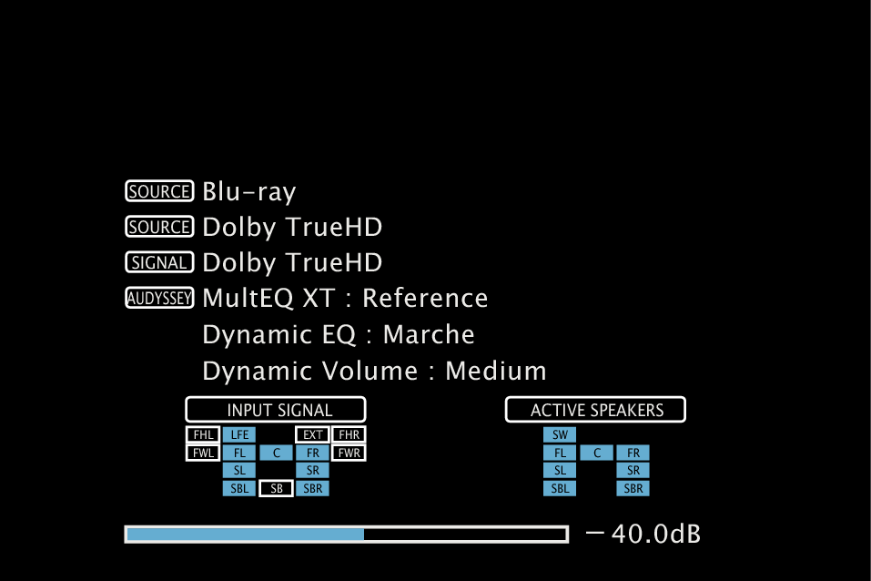 Le nombre de canaux de signal d’entrée (présence de canaux avant, surround, LFE) s’affiche. |
