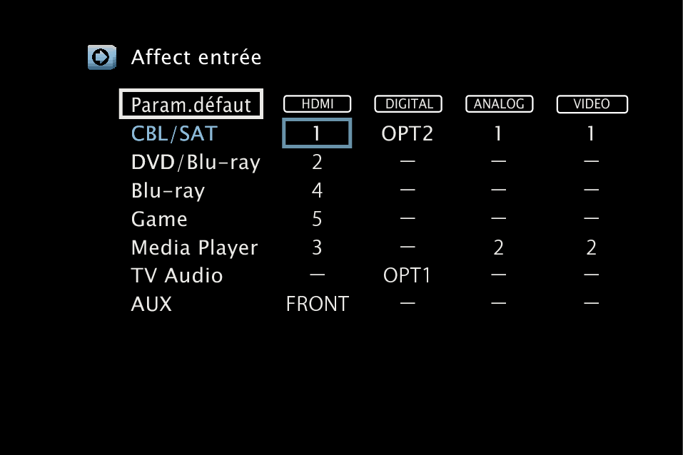 Les paramètres “Affect entrée” sont rétablis à ceux par défaut.
