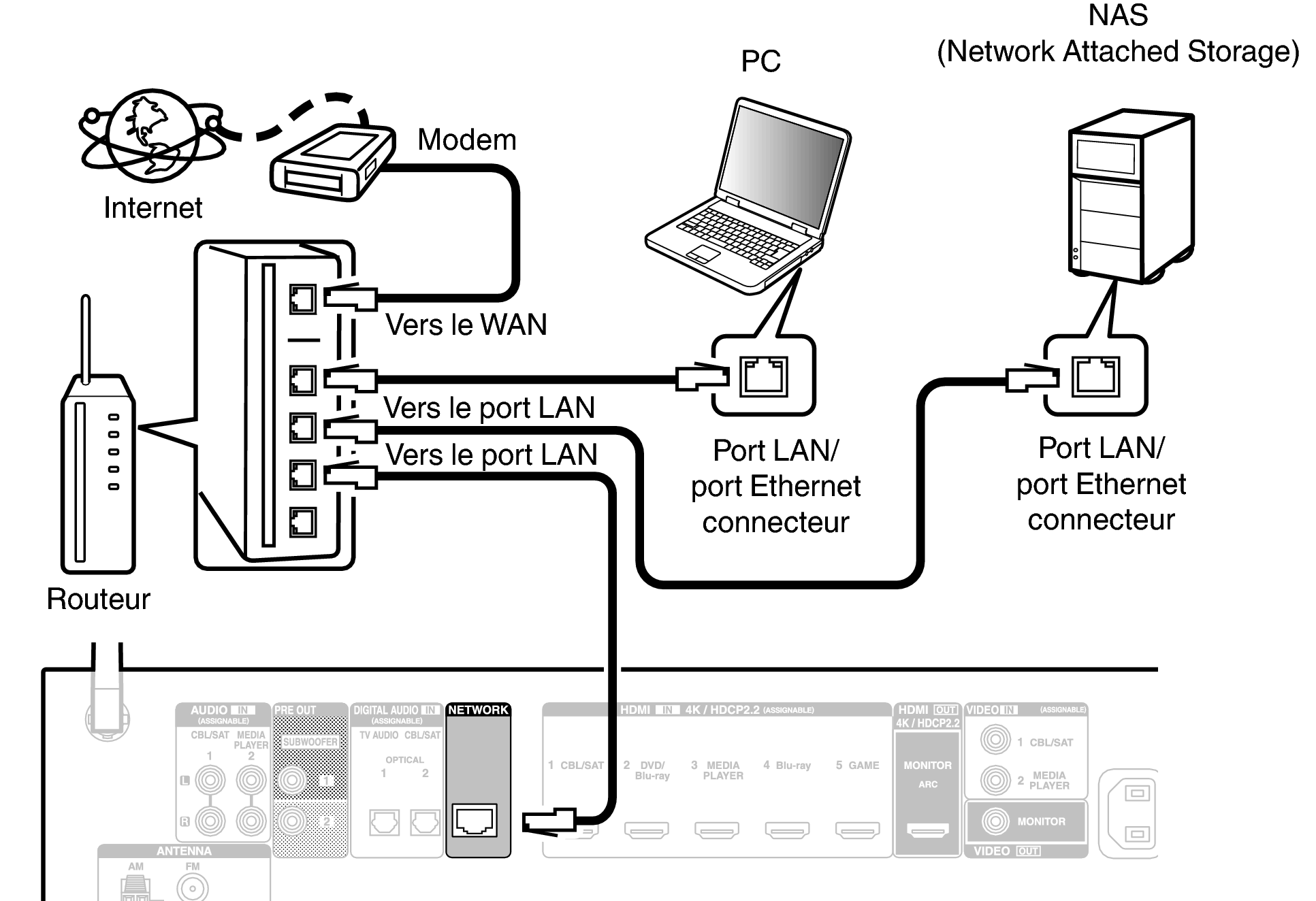 Pour effectuer des connexions via un LAN câblé, utilisez un câble LAN pour connecter le routeur à cet appareil, comme illustré dans la figure ci-dessous.
