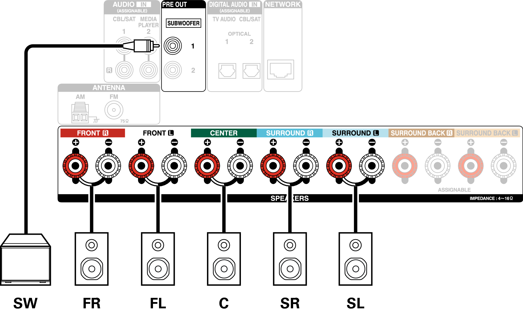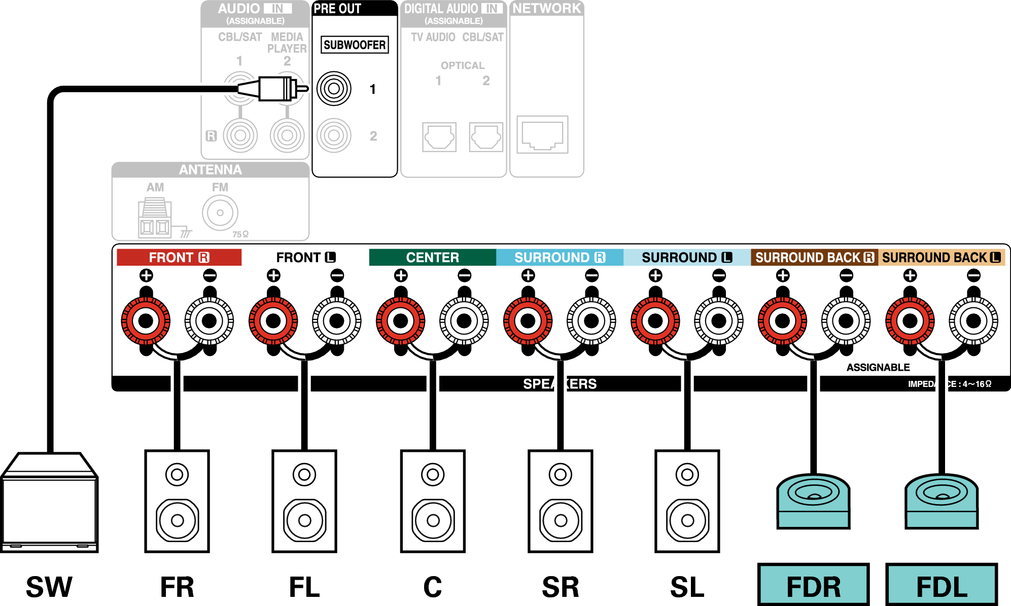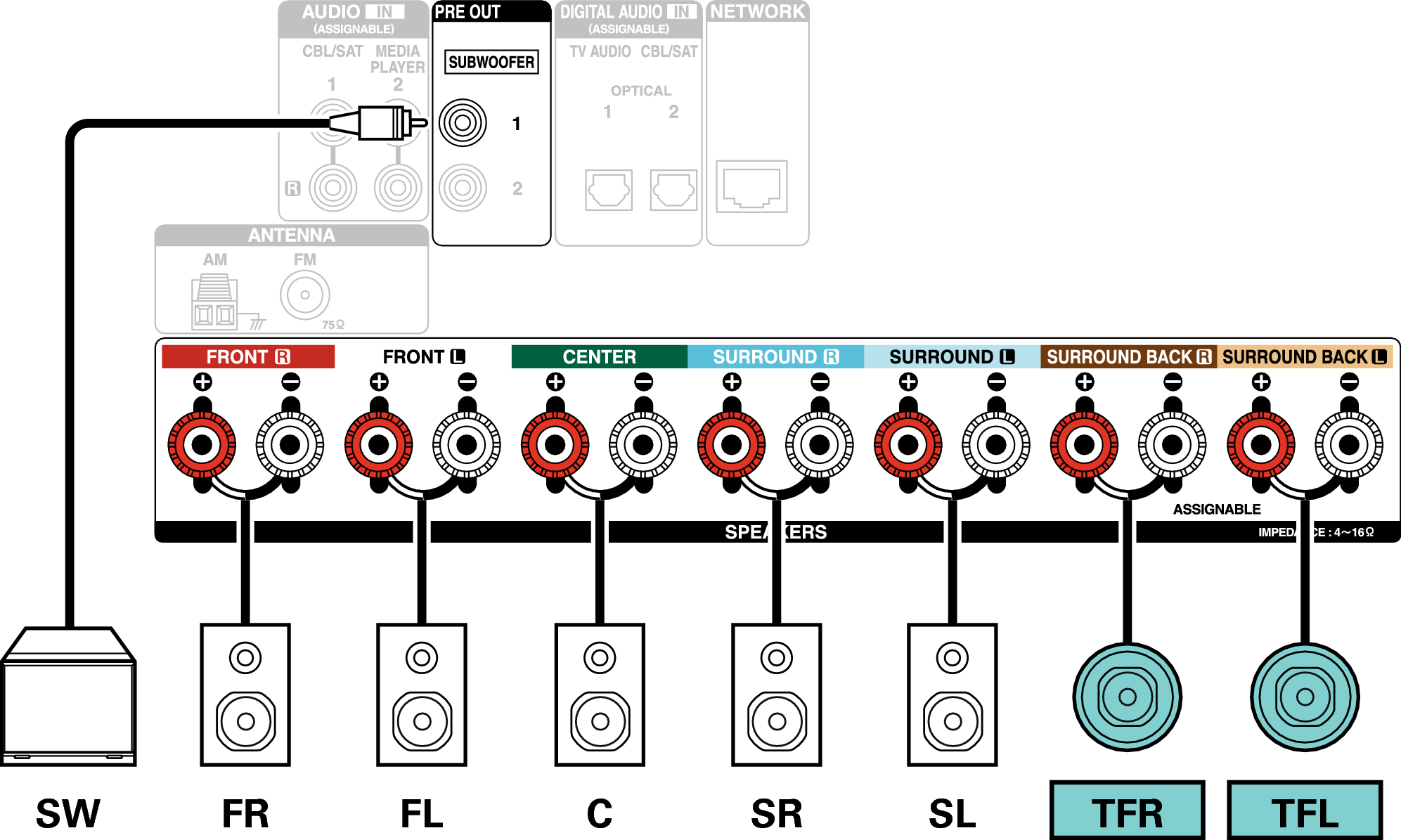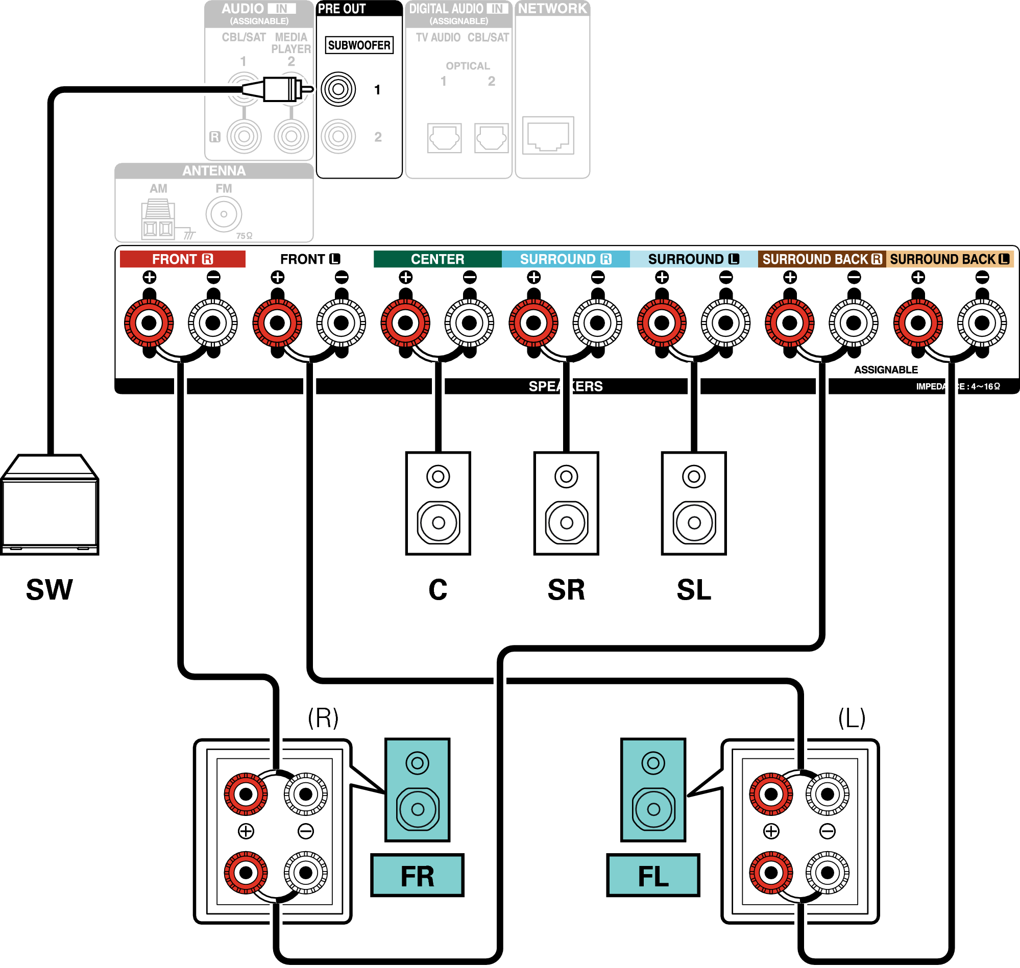 Cet appareil est équipé d’un amplificateur de puissance de canal 7. En plus du système du canal 5.1 de base, une variété de systèmes d’enceinte peut être configurée en changeant les paramétrages de “Affect.Amplis” en fonction de l’application, par exemple les systèmes du canal 5.1, les connexions bi-amplificateur et les systèmes à 2 canaux pour la lecture multizone. lien