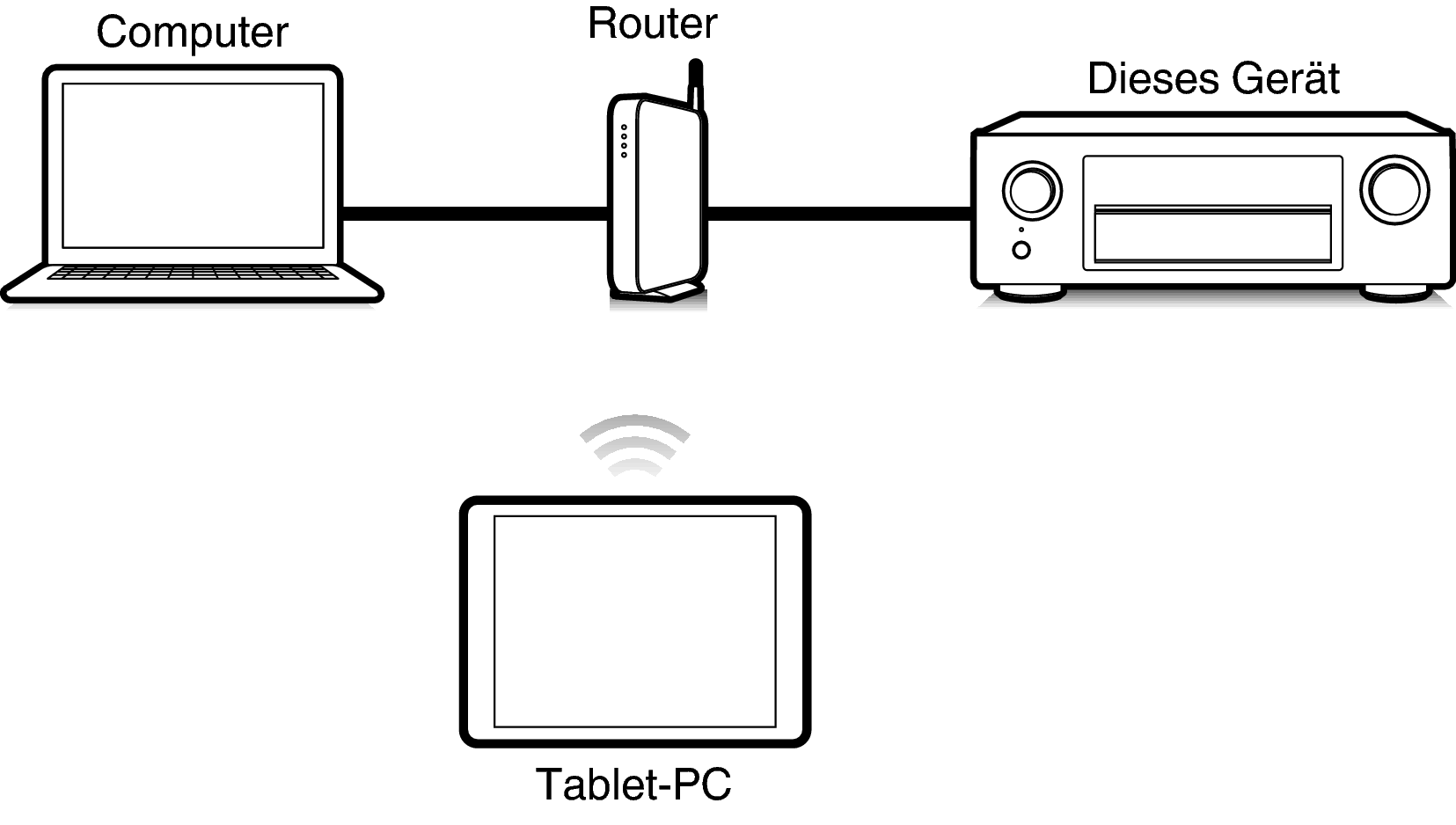 Dieses Gerät und der Computer oder Tablet-PC müssen ordnungsgemäß mit dem Netzwerk verbunden sein, um die Netzwerk-Steuerfunktion verwenden zu können. (Anschließen an ein Heim-Netzwerk (LAN)Link)