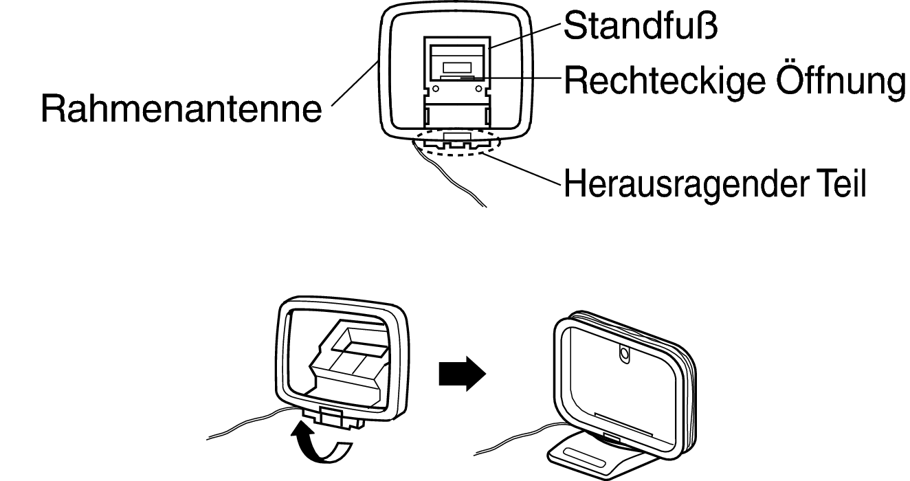 Führen Sie den Standfußteil auf der Rückseite unten an der Rahmenantenne ein, und biegen Sie ihn nach vorne um.