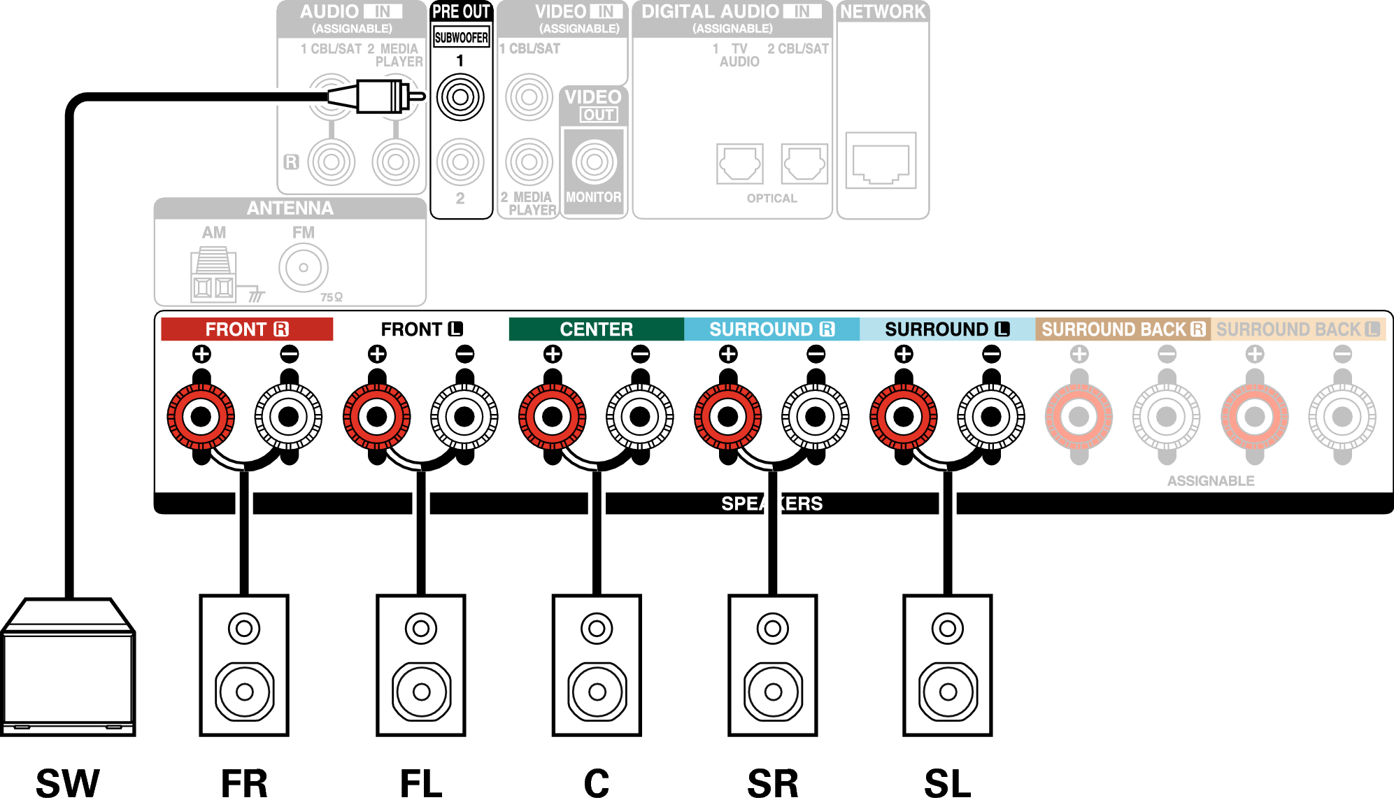 连接5.1声道扬声器:前置扬声器的双功放连接